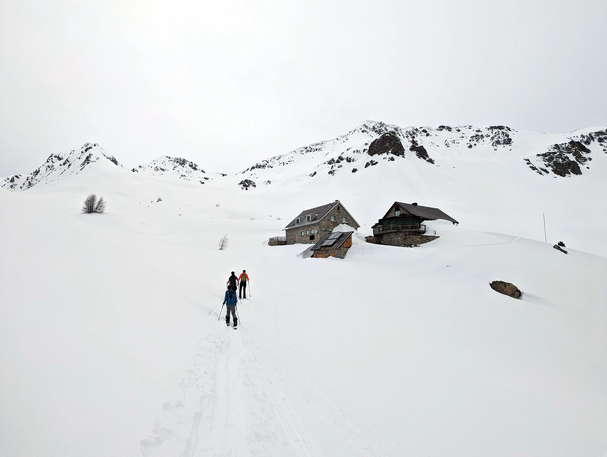 Klassische Skitourenausrüstung mit LVS-Set. Etwas Verpflegung und Getränke. Die Hütte ist im Winter nicht bewirtschaftet.