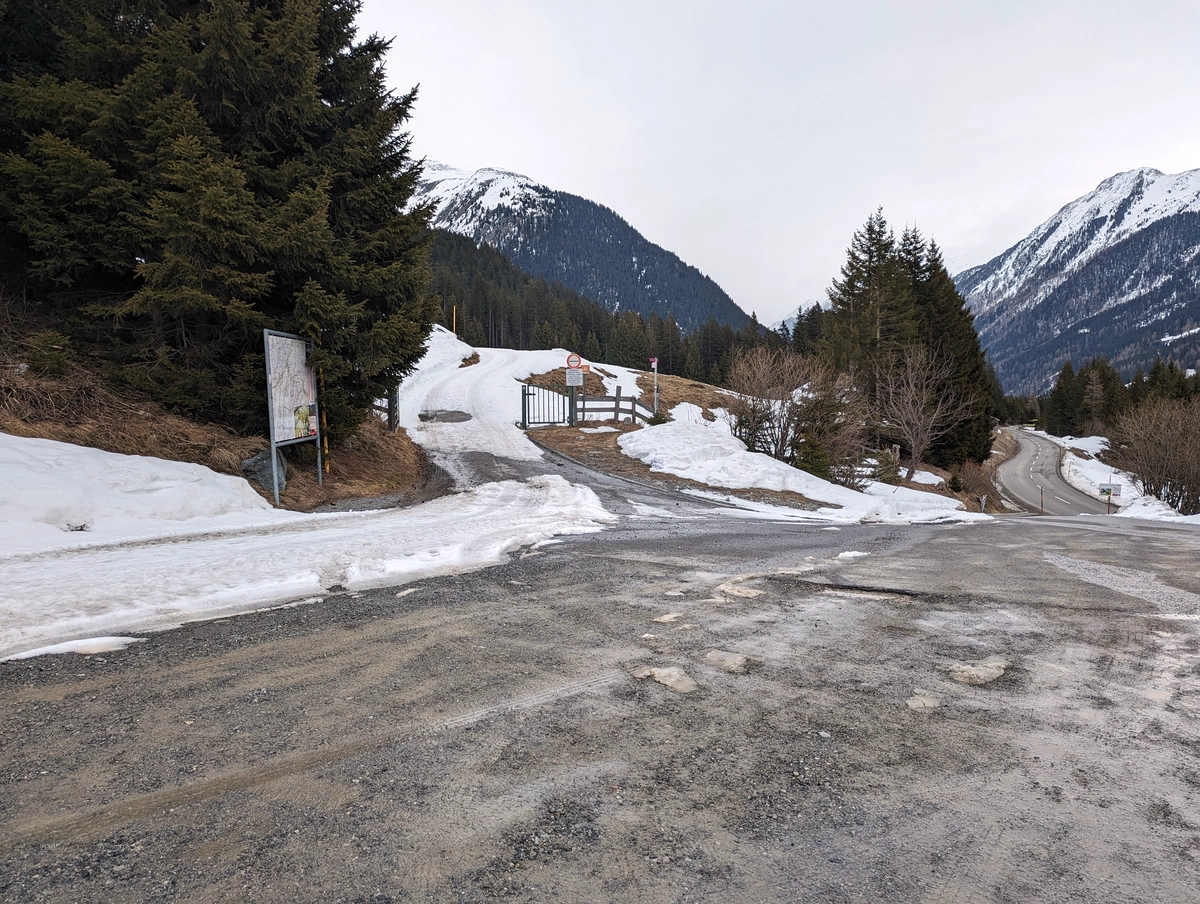Auf der Paznaunstraße zwischen Valzur (Nähe Mathon) und Piel (Nähe Galtür) befindet sich direkt neben der Straße der "Parkplatz Friedrichshafener Hütte". Die kurze Zufahrt (ca. 10 Meter) ist in etwas schlechtem Zustand, da die Straße in der Mitte leicht nach oben aufgebrochen ist. Wer ein tief liegendes Auto hat, sollte demnach nicht mittig hochfahren.