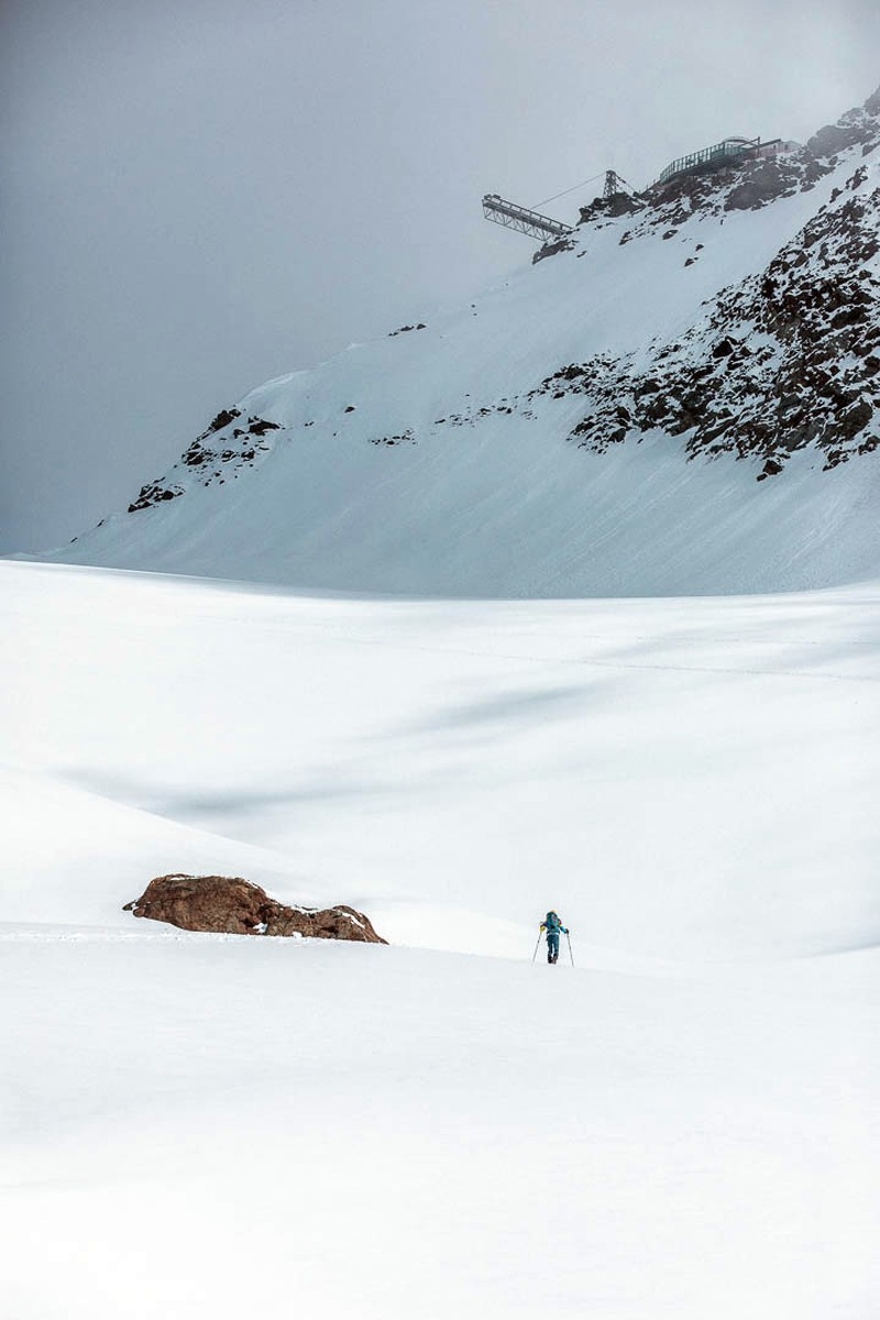 - Anschließend links auf das Tiefenbachjoch (3.160 m) aufsteigen, rechts davon ist die Aussichtsplattform des Skigebiets in Sölden zu sehen.