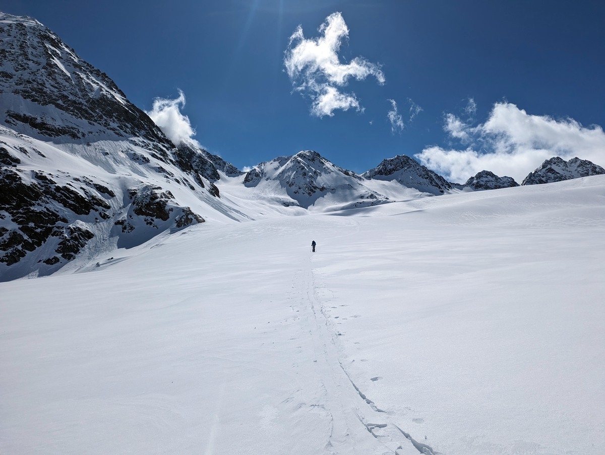Exposition: Quasi alle. Über die Notabfahrt Nordwest und Nordost. Im Aufstieg am Gletscher Nordwest, Süden und im Schlussabschnitt Ost und Nord. In der Abfahrt zur Notabfahrt Nord und West.