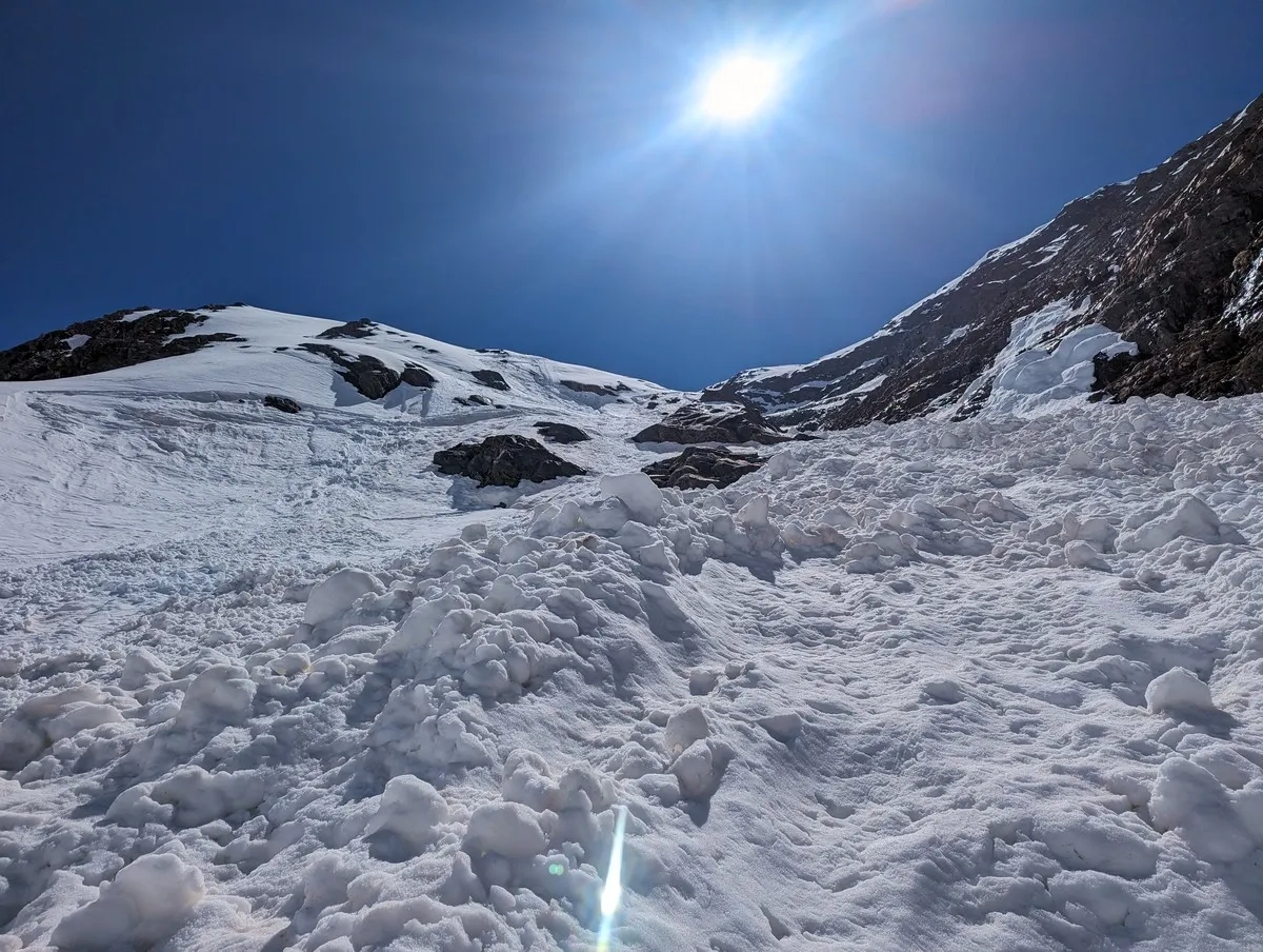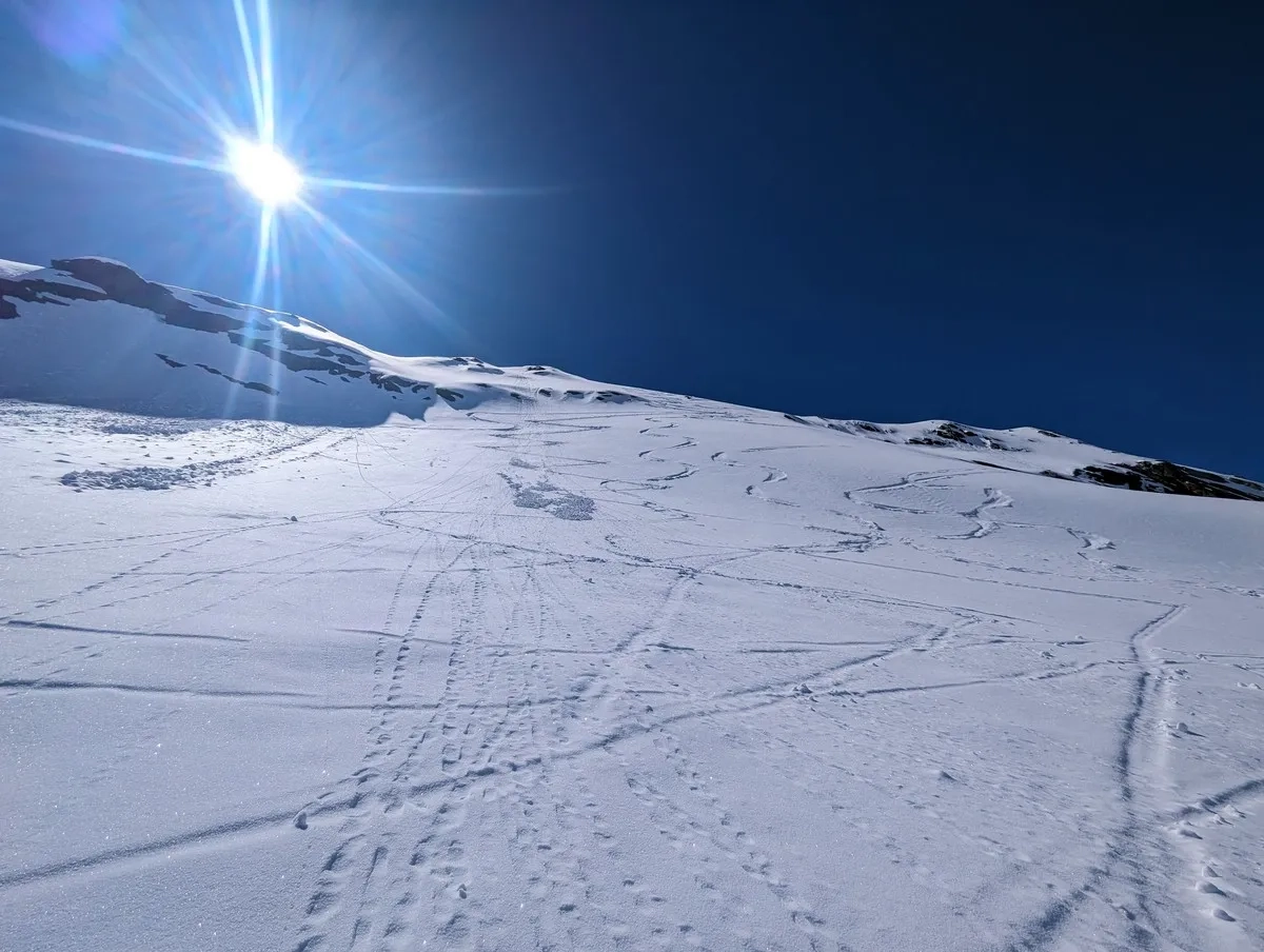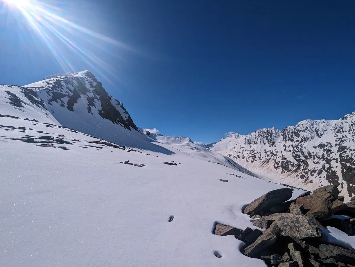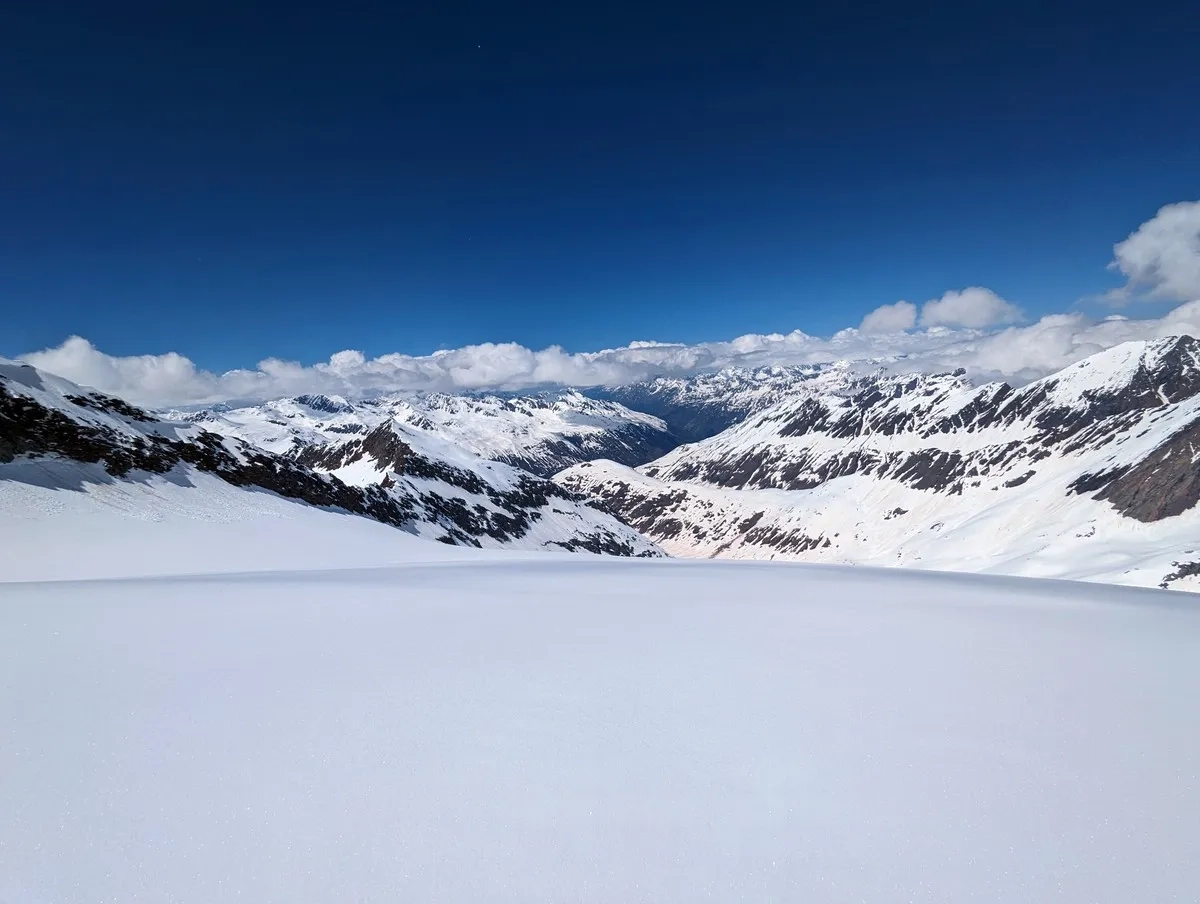 In der Abfahrt vom Wasserfallferner nicht zu weit rechts halten (steile Felswände).