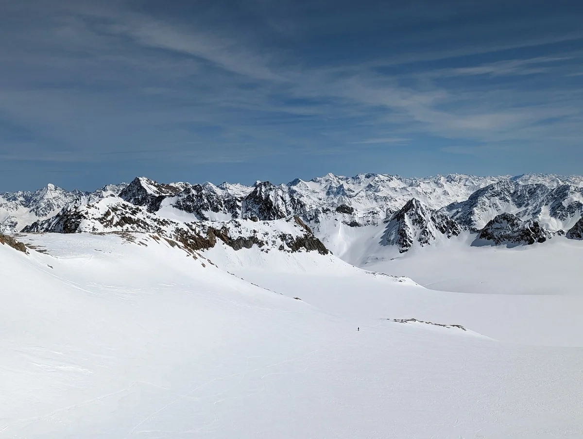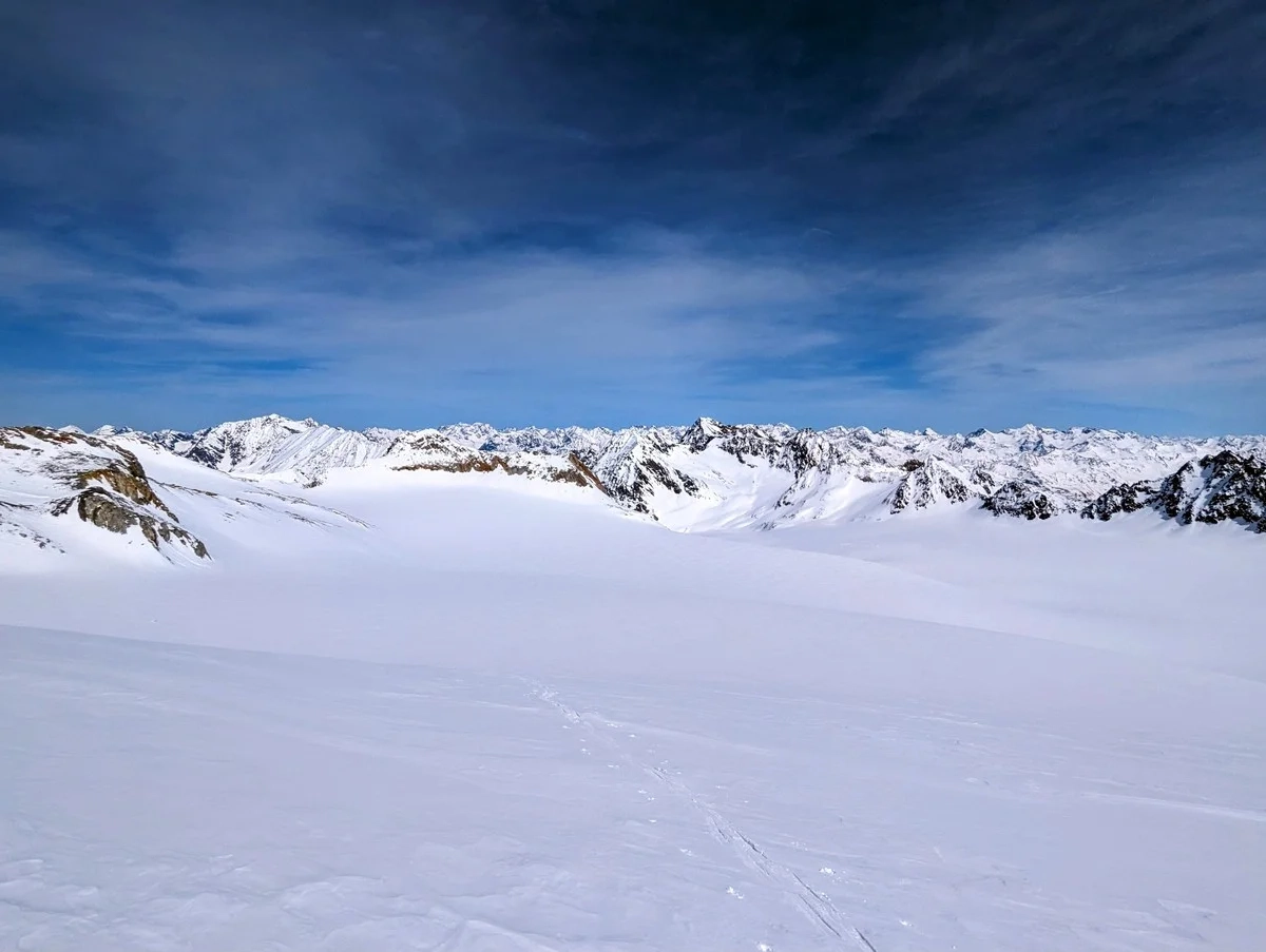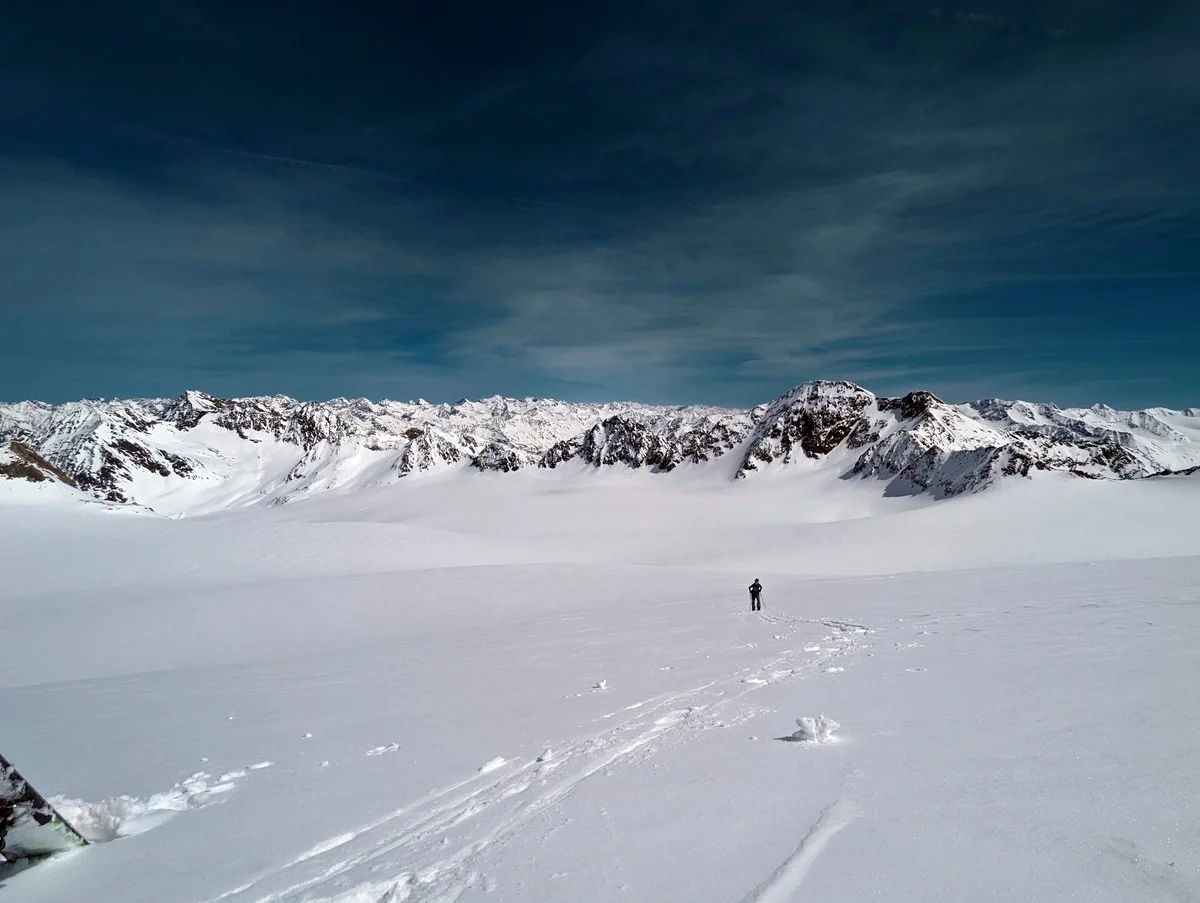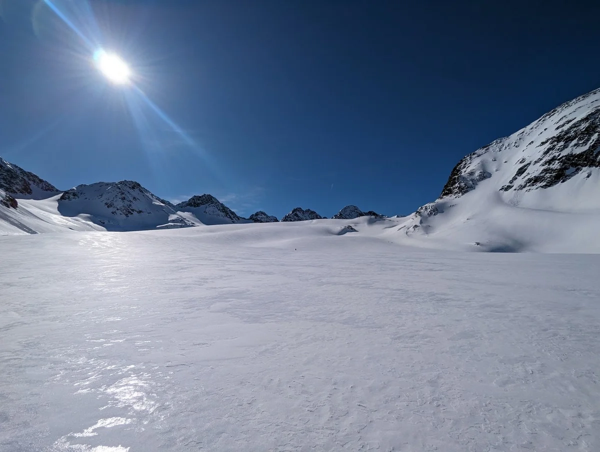 - Abfahrt nun direkt am breiten Mittelbergferner, der durchgehend flach ist (ausgenommen die Abfahrt vom Gipfelhang).