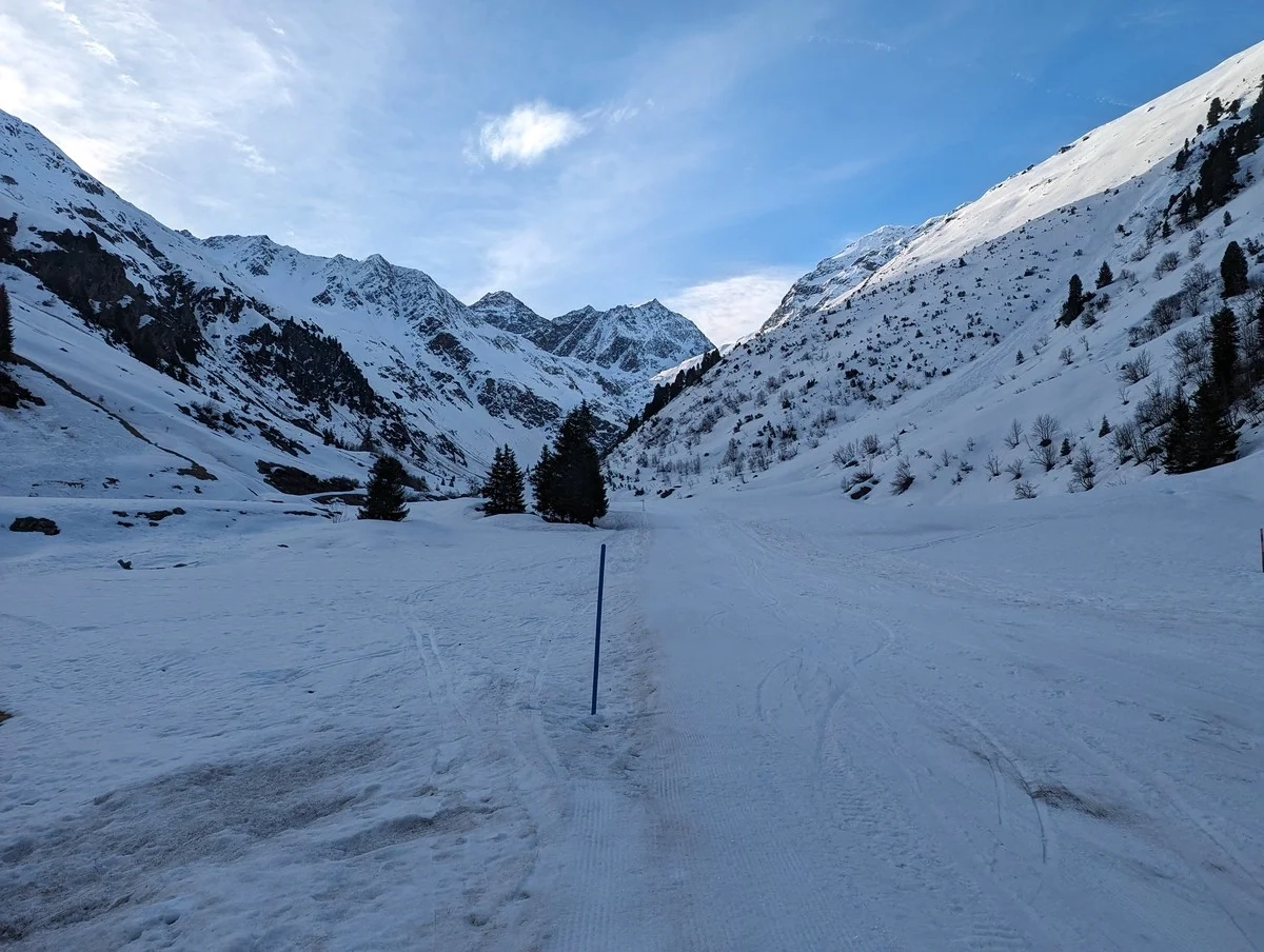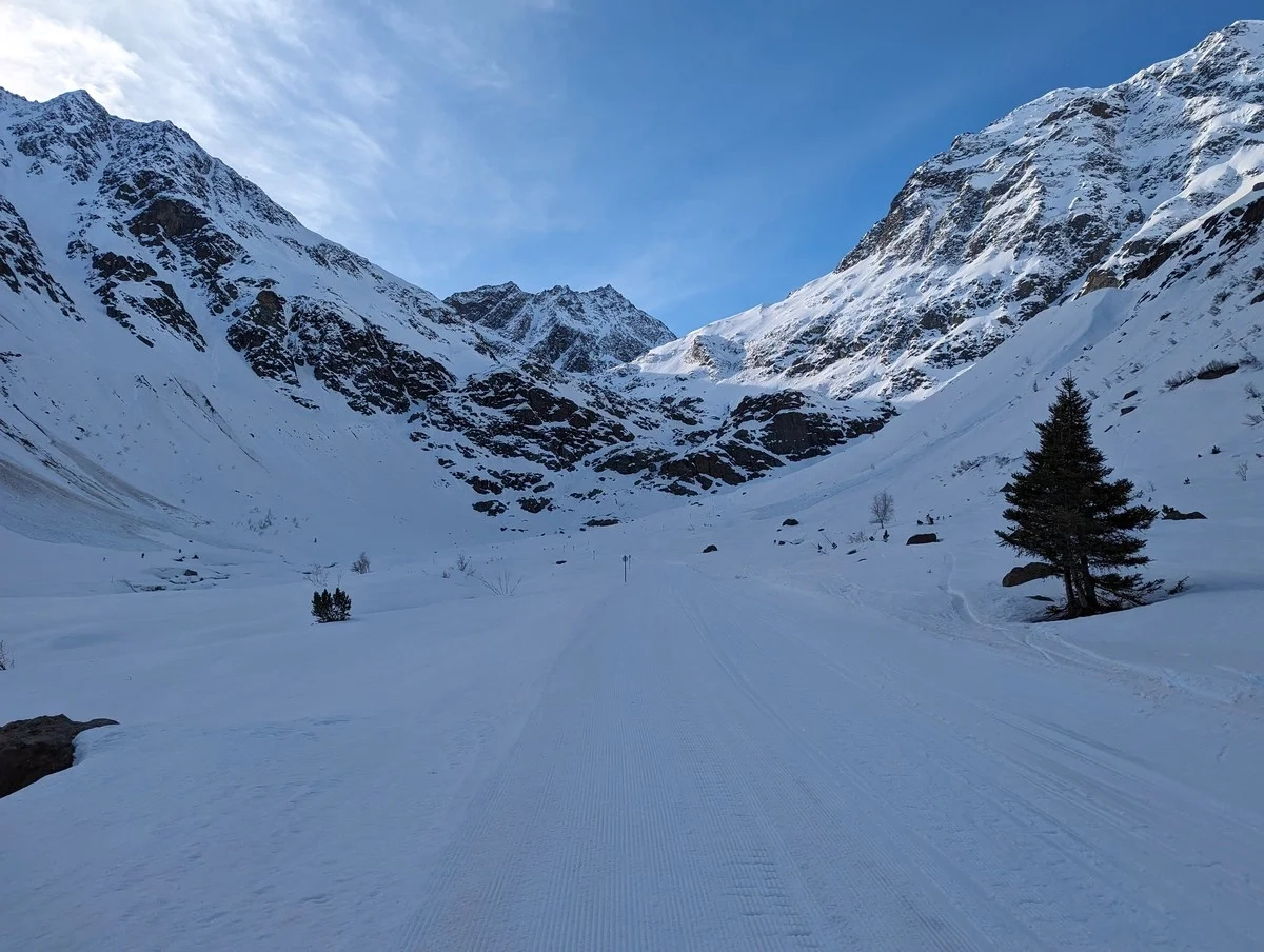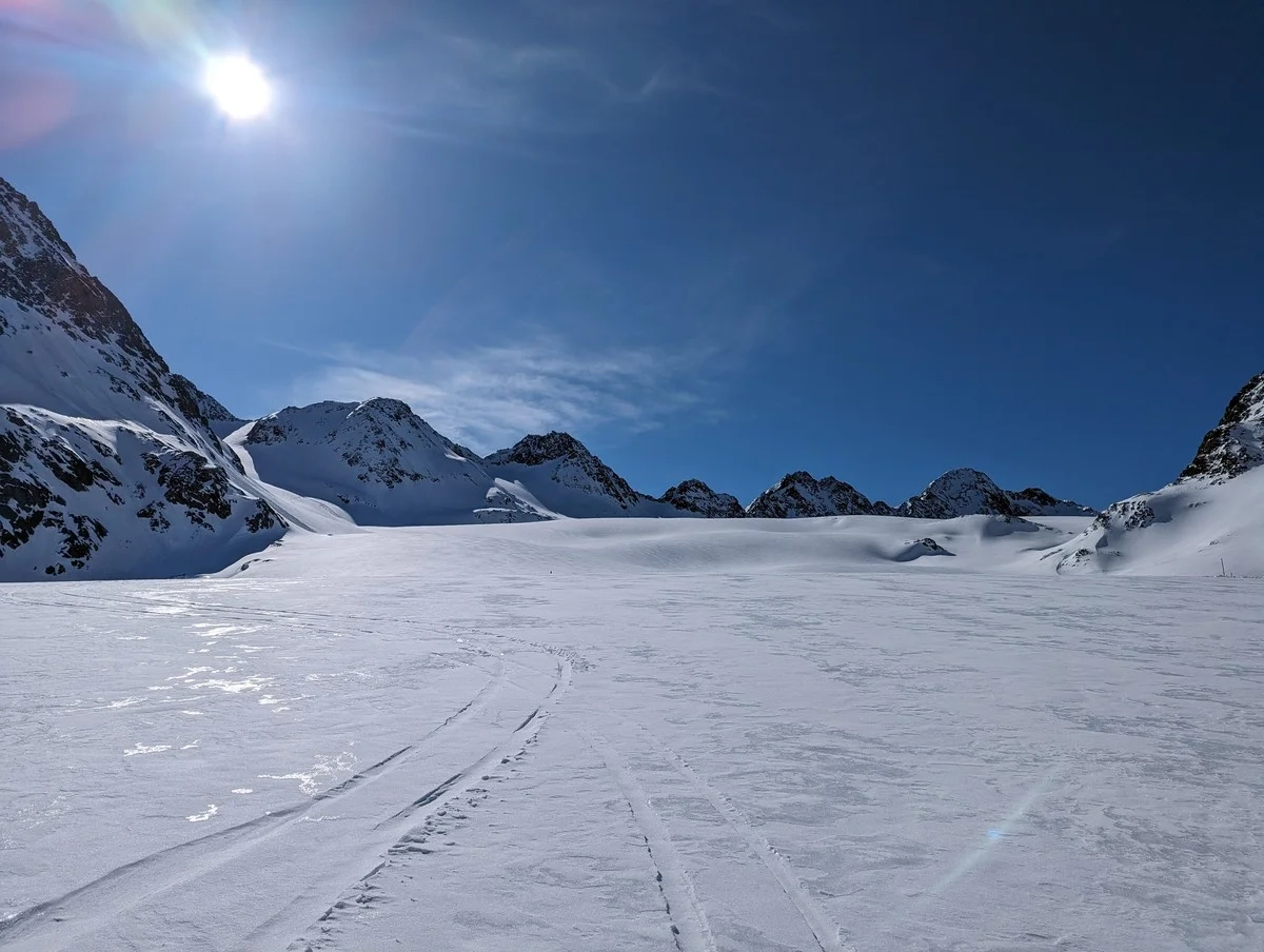 - Aufstieg über die Notabfahrt (ca. 940 Höhenmeter, durchgehend einfach), bis der Mittelbergferner bei der Höhen-Langlaufloipe am Rande des Skigebiets Pitztaler Gletscher erreicht wird. Dieser Abschnitt kann auch mit der Bergbahn abgekürzt werden. Dazu fahrt ihr mit der "Tunnelbahn Gletscherexpress" in das Skigebiet und dort über die rote Piste Nr. 25 zur Talstation der Mittelbergbahn und bei dieser noch ein Stück bergab zum Beginn der Notabfahrt bzw. der Langlauf-Höhenloipe am Mittelbergferner.