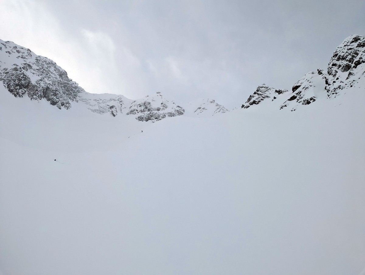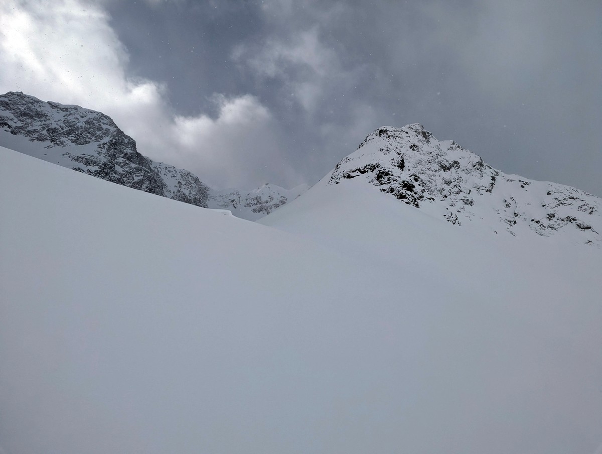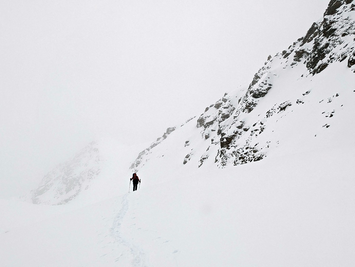 Die Schlüsselstelle der Skitour ist ohne Zweifel der Schlusshang (Nordosthang) mit einer steilen Rinne. Ist dieser Abschnitt gespurt und sind die Verhältnisse gut, sollte der Hang mit guter Spitzkehrentechnik sicher umsetzbar sein. Bei weniger guten Bedingungen wird die Schwierigkeit zusätzlich erhöht. Wir sind mitten im Steilhang aufgrund der Bedingungen (Schneefall, schlechte Sicht, Lawinengefahr) umgekehrt.