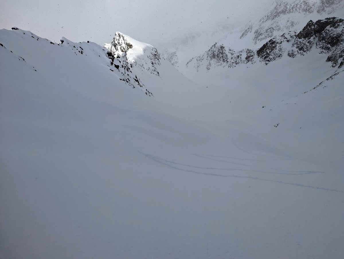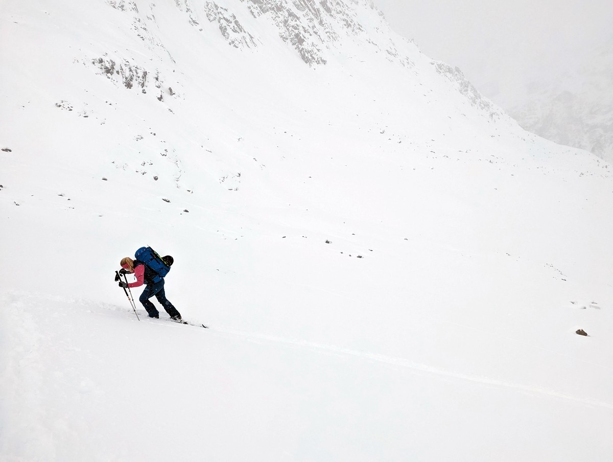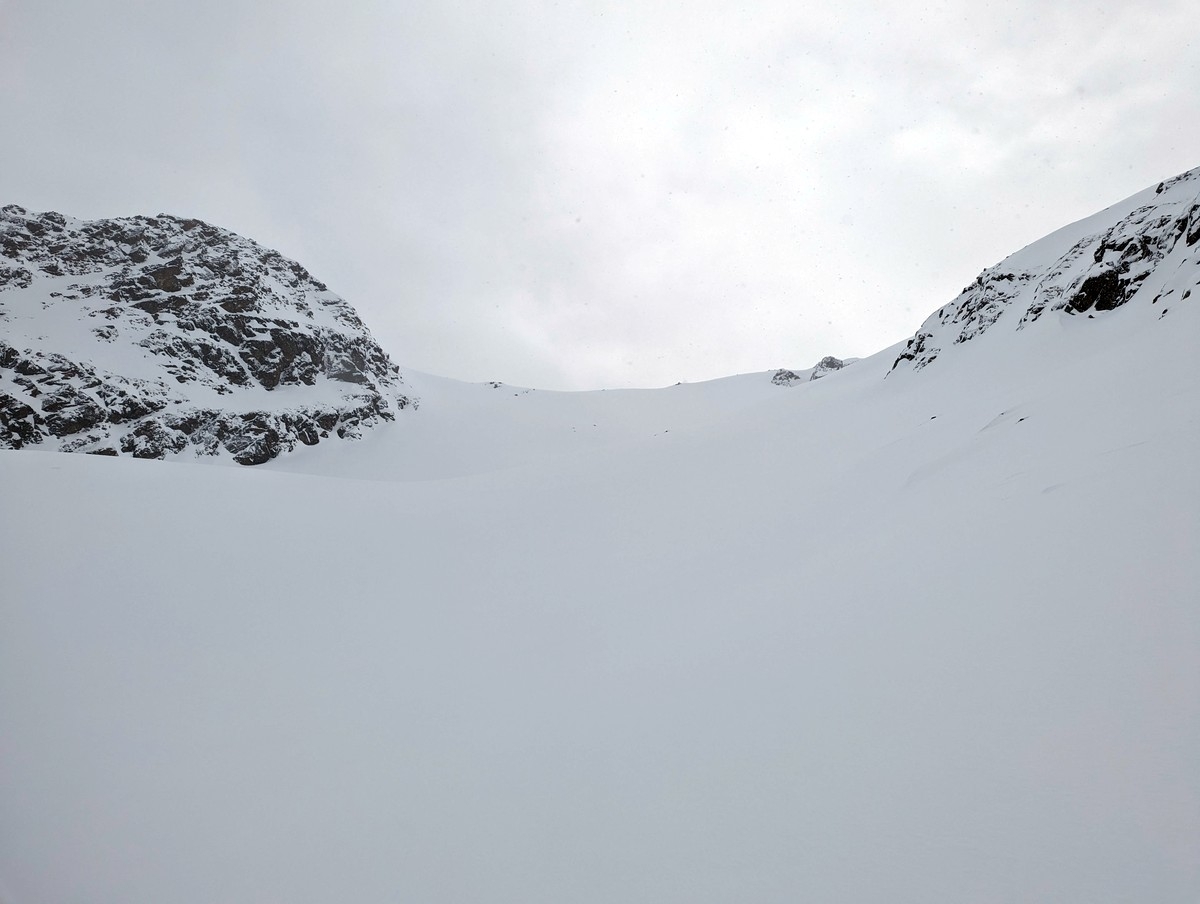Die Schlüsselstelle der Skitour ist ohne Zweifel der Schlusshang (Nordosthang) mit einer steilen Rinne. Ist dieser Abschnitt gespurt und sind die Verhältnisse gut, sollte der Hang mit guter Spitzkehrentechnik sicher umsetzbar sein. Bei weniger guten Bedingungen wird die Schwierigkeit zusätzlich erhöht. Wir sind mitten im Steilhang aufgrund der Bedingungen (Schneefall, schlechte Sicht, Lawinengefahr) umgekehrt.