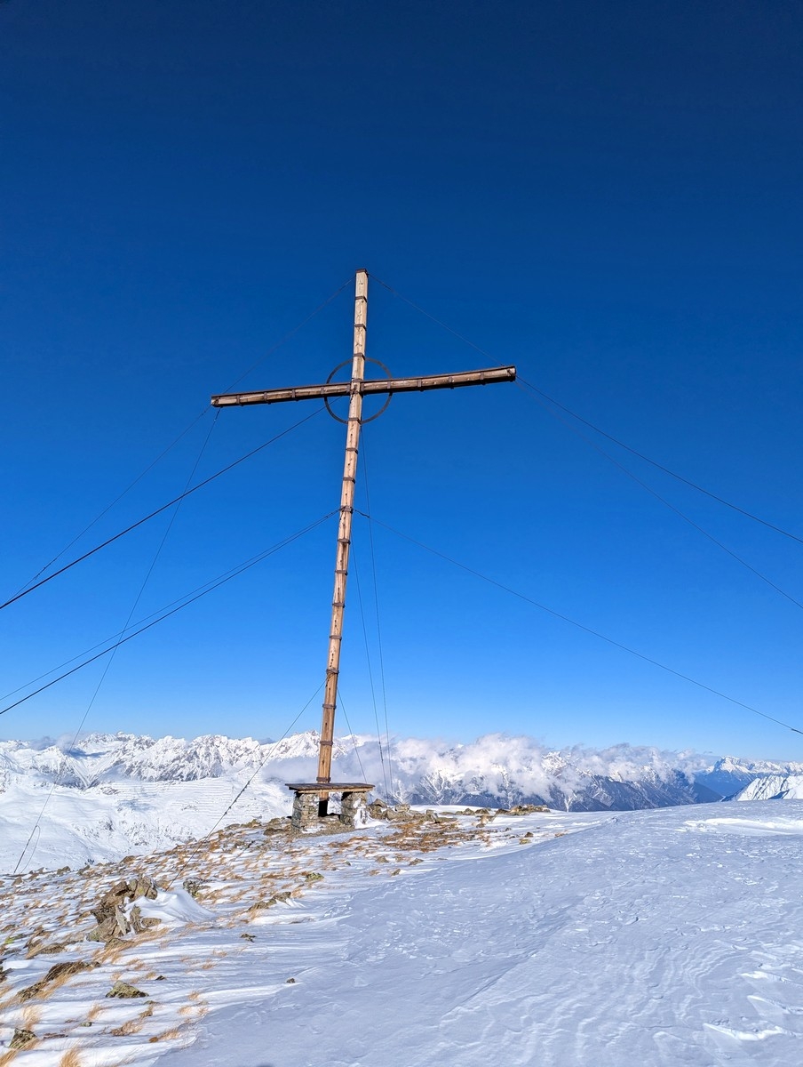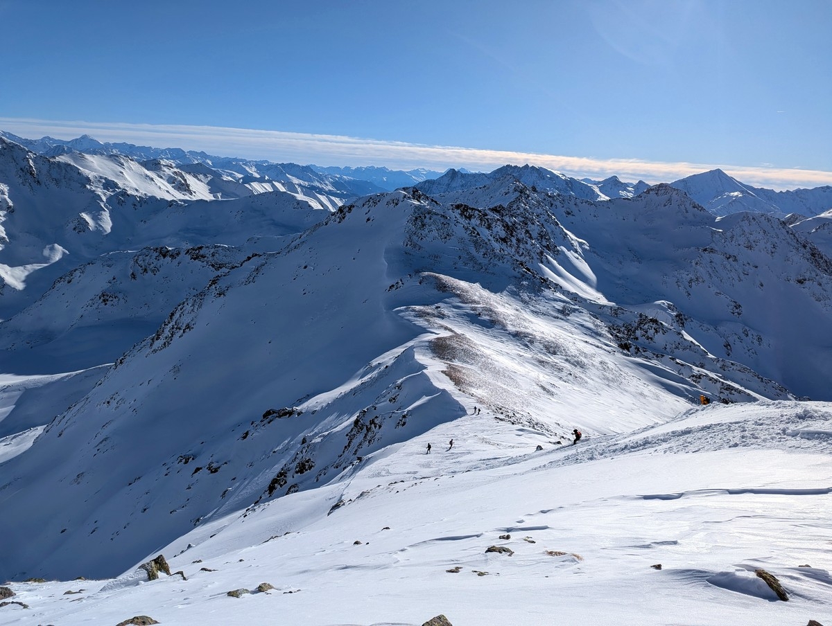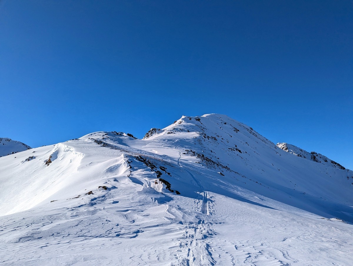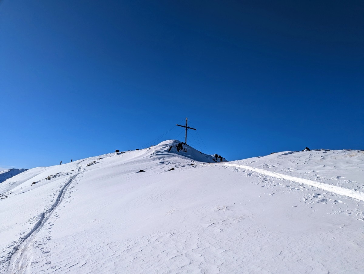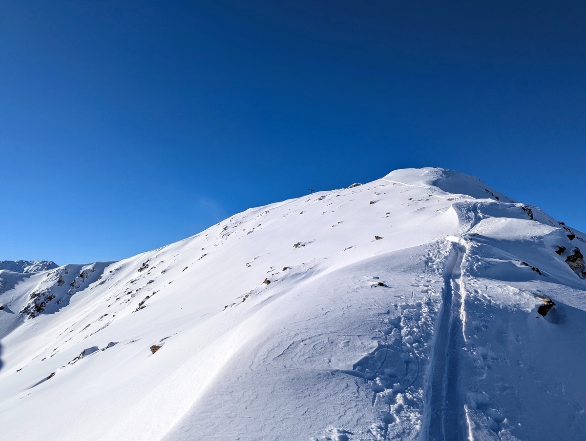 Tipp: Der Grat kann je nach Bedingungen etwas heikel zu begehen sein, auch wenn dieser sehr breit ist. Harscheisen können da durchaus sinnvoll sein. Bei starken Schneeverwehungen müssen evtl. auch die Ski abgeschnallt werden. Bei guten Bedingungen ist der breite Grat aber für den geübten Skitourengeher keine allzugroße Herausforderung
