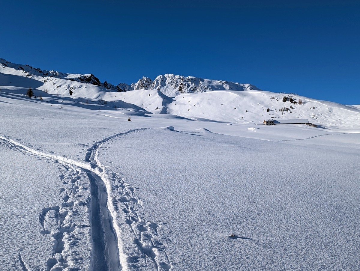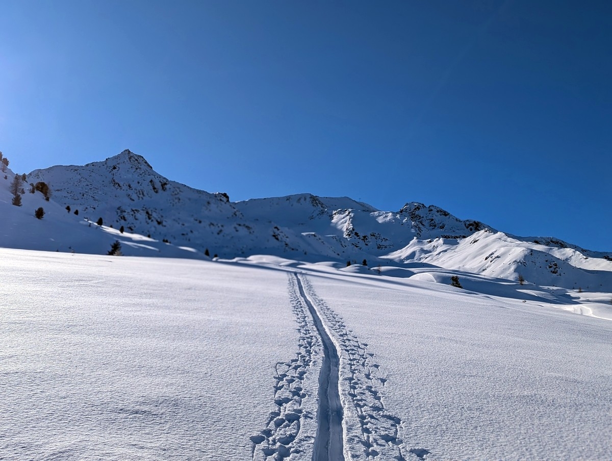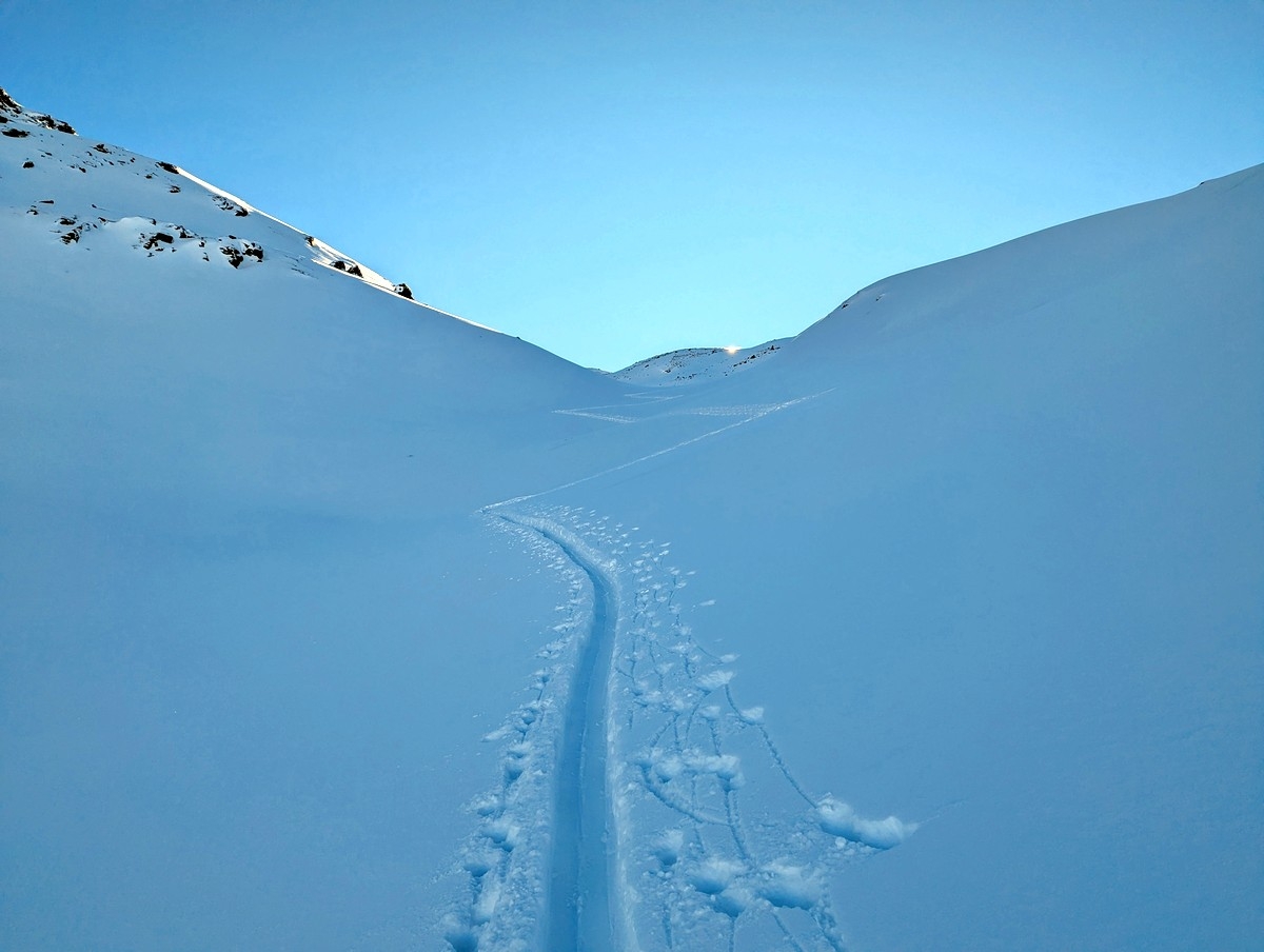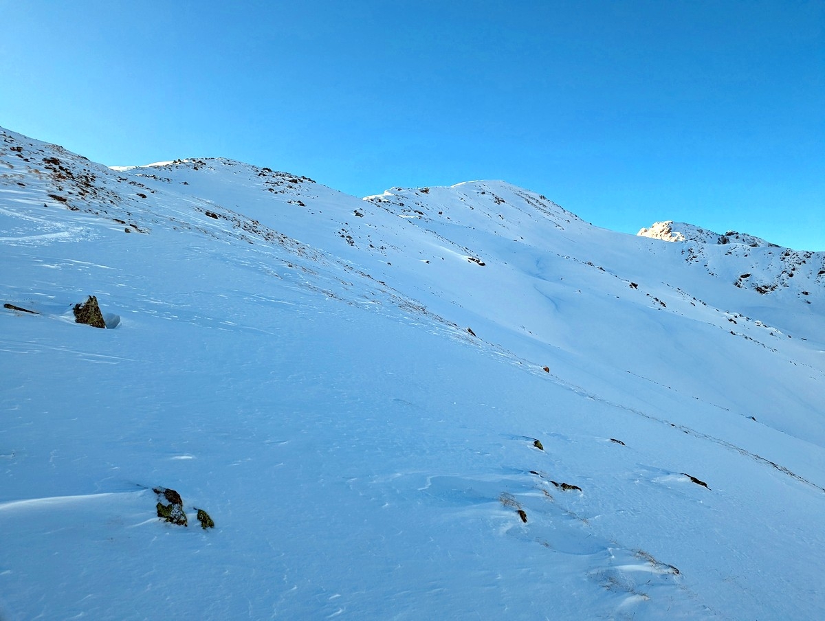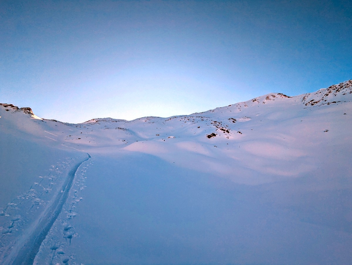 Tipp: Der Grat kann je nach Bedingungen etwas heikel zu begehen sein, auch wenn dieser sehr breit ist. Harscheisen können da durchaus sinnvoll sein. Bei starken Schneeverwehungen müssen evtl. auch die Ski abgeschnallt werden. Bei guten Bedingungen ist der breite Grat aber für den geübten Skitourengeher keine allzugroße Herausforderung