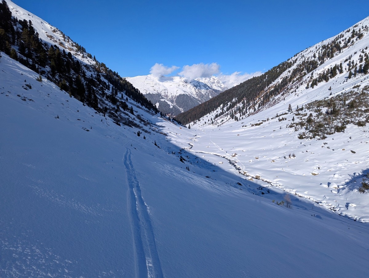 Die Route startet im Skigebiet See und bietet während des Aufstiegs fantastische Ausblicke auf die umliegenden Gipfel. Wer die Gondelbahn Medrigjoch nutzt, spart sich bequem 400 Höhenmeter. Dennoch bleibt die Tour mit insgesamt 1.800 Höhenmetern (bzw. 1.400 Höhenmetern, wenn im Aufstieg die Gondel zur Hilfe genommen wird) sportlich. Der finale Gratabschnitt fordert bei schwierigen Bedingungen etwas Erfahrung, ist jedoch für geübte Skitourengeher ein Highlight.