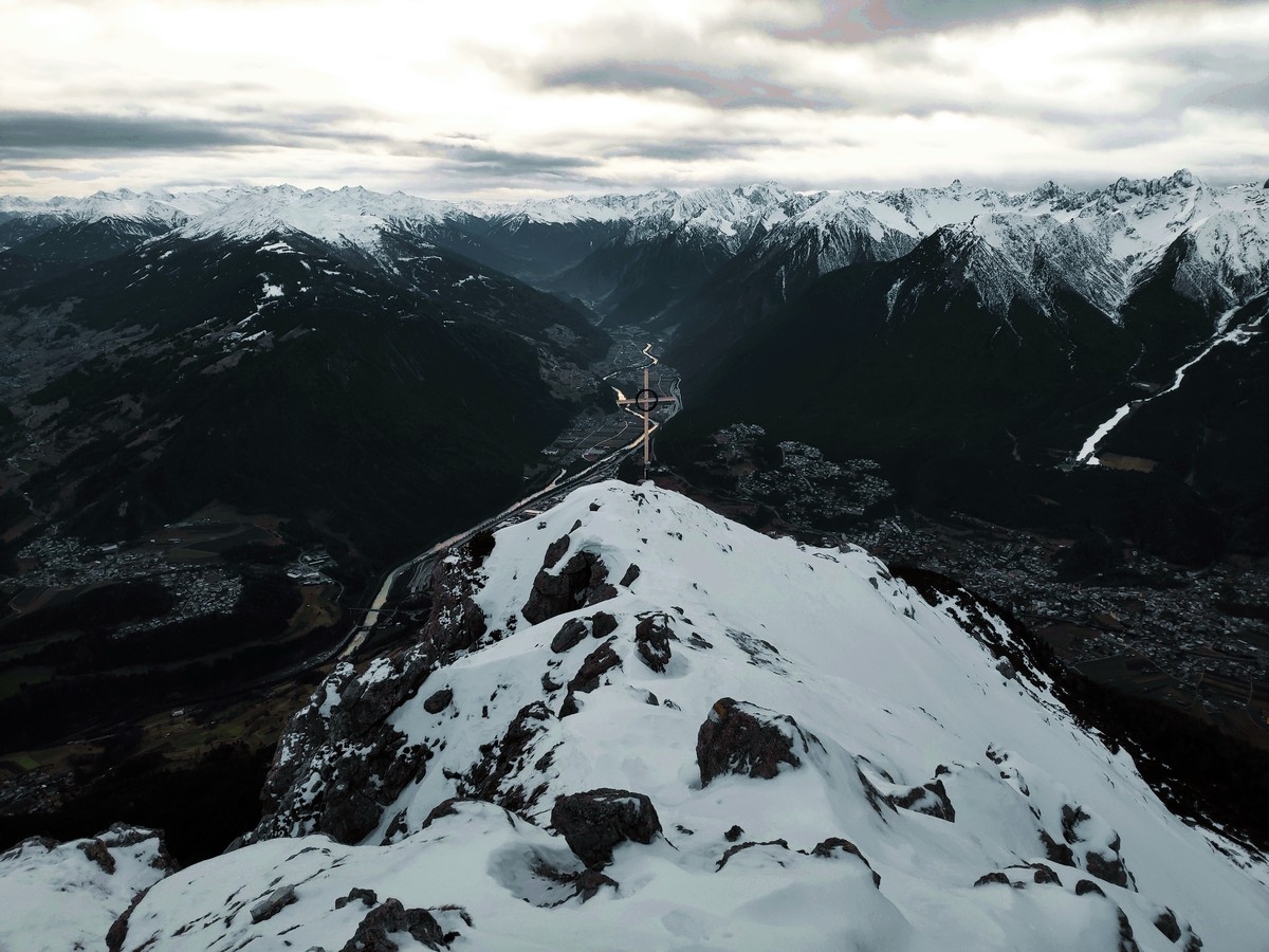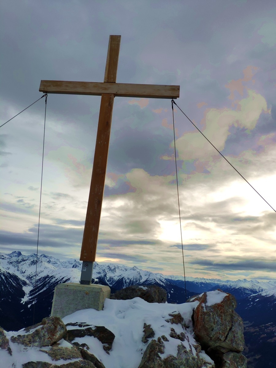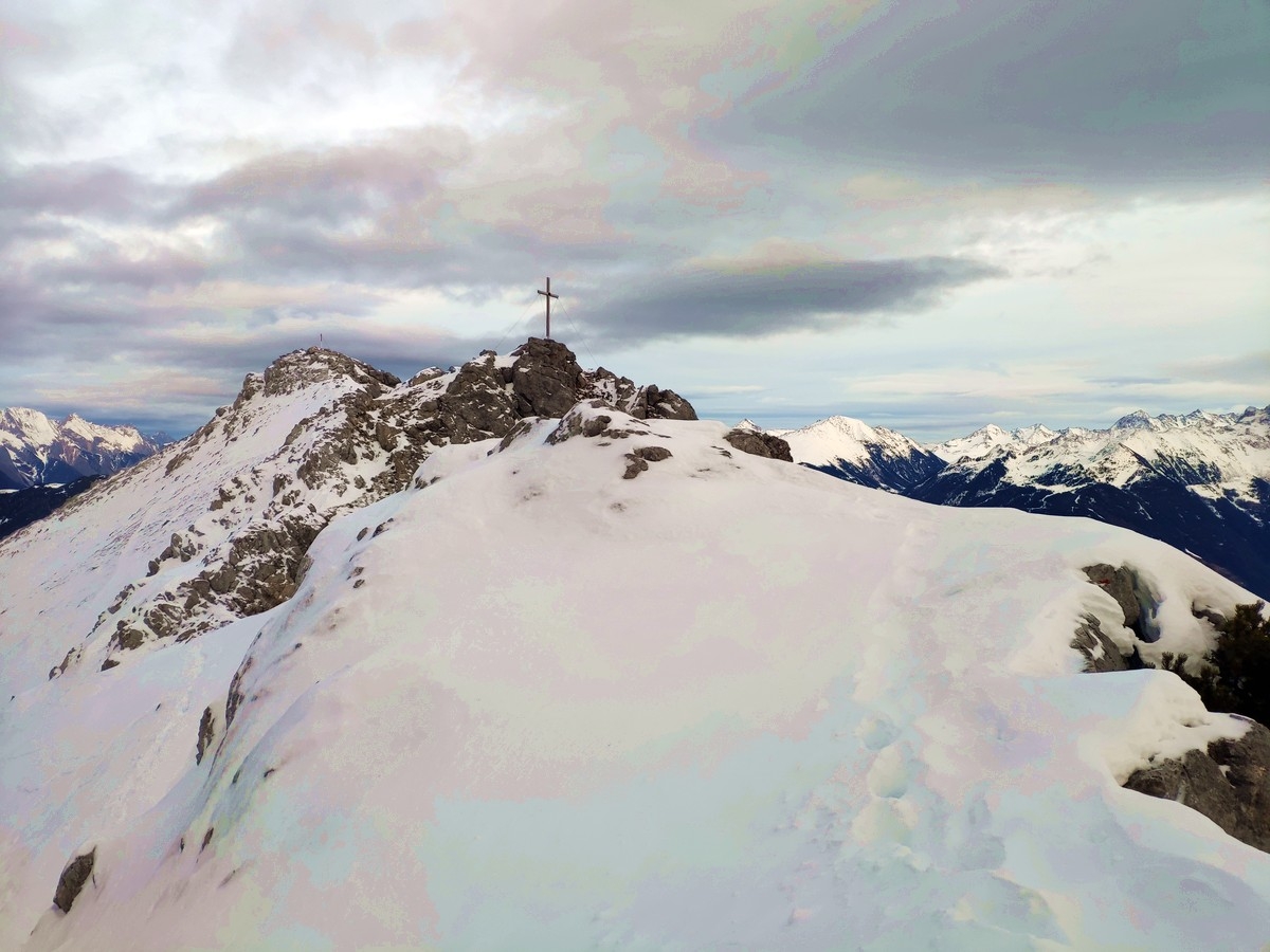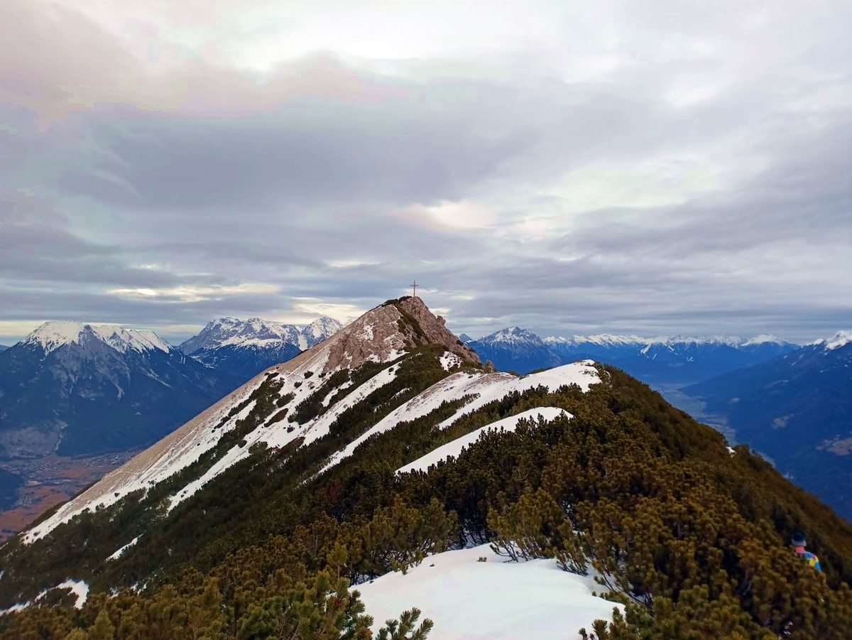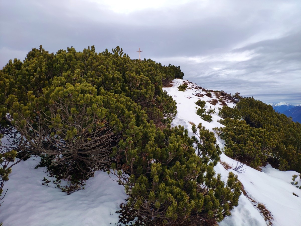- Auf gut 2.200 Metern Höhe ist der Grat erreicht. Nun folgt ein kurzer Abstecher Richtung Norden (in entgegengesetzte Richtung zum Tschirgant) zum Zwölferköpfl (= Haiminger Kreuz). Das neue Gipfelkreuz wurde im Jahr 2022 aufgestellt.