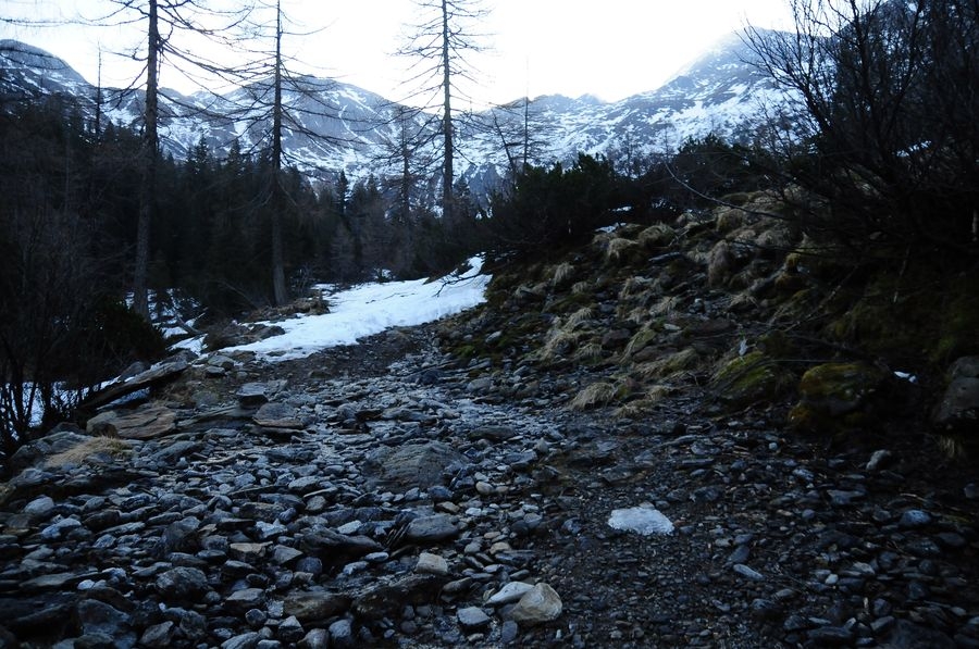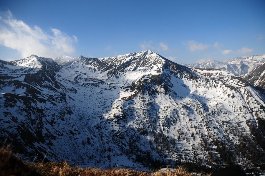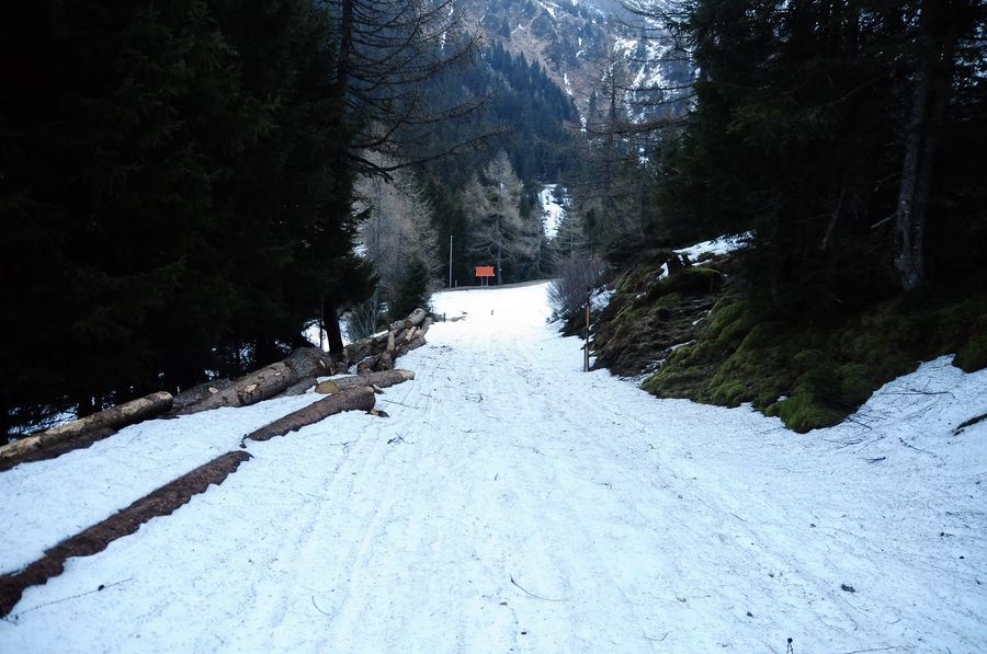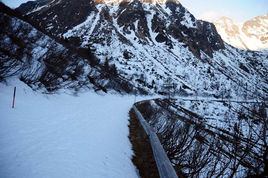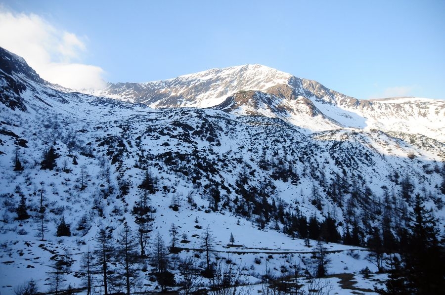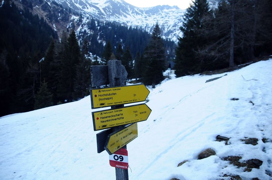 Die ursprünglich geplante Wanderung sollte bei der Winklerkehre (1.490 m) starten und über den Hochstubofen (2.385 m) auf die Rettlkirchspitze (2.475 m) führen. Doch der Sölkpass, der mich zum Startpunkt führen sollte, war aufgrund der Schneeverwehungen gesperrt. So musste ich 6,5 km vor der Winklerkehre beim Alpengasthof Kreuzerhütte (1.378 m) meine Tour beginnen. Da ich nicht die ganze Zeit die verschneite Straße entlang gehen wollte, versuchte ich eine Abkürzung über einen Forstweg. Doch je weiter ich ging, desto mehr entfernte ich mich vom Sölkpass. Irgendwann war mir klar, dass ich entweder umdrehen musste oder ein paar Steilhänge hinauf kraxeln musste um doch wieder zum richtigen Weg zu finden. Ich entschied mich natürlich für Variante B (siehe Bilder). Nach etwa einer Stunde Kraftarbeit war ich dann endlich wieder auf der Straße die von Schneemassen und teilweise Glatteis bedeckt war. Dort ging es auf den höchsten Punkt des Sölkpasses (1.788 m) hinauf, ehe es rund 300 Höhenmeter bergab zur Winklerkehre ging. Gestartet kurz nach 6 Uhr war ich also um 8 Uhr endlich bei dem ursprünglich geplanten Start und schön etwas müde. Nicht nur aufgrund des „Abkürzers“ sondern auch des kniehohen Schnees, der Schritt für Schritt ordentlich an Kraft kostete.