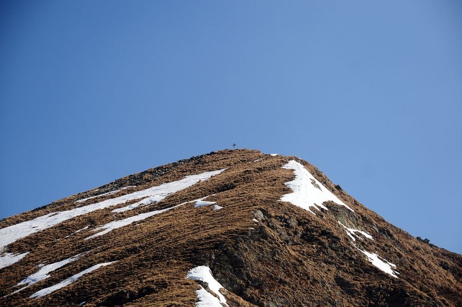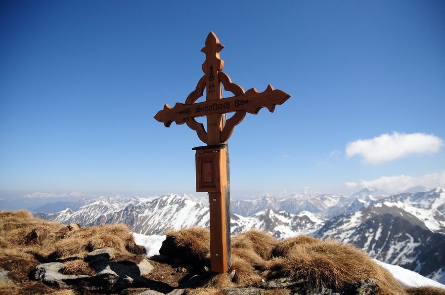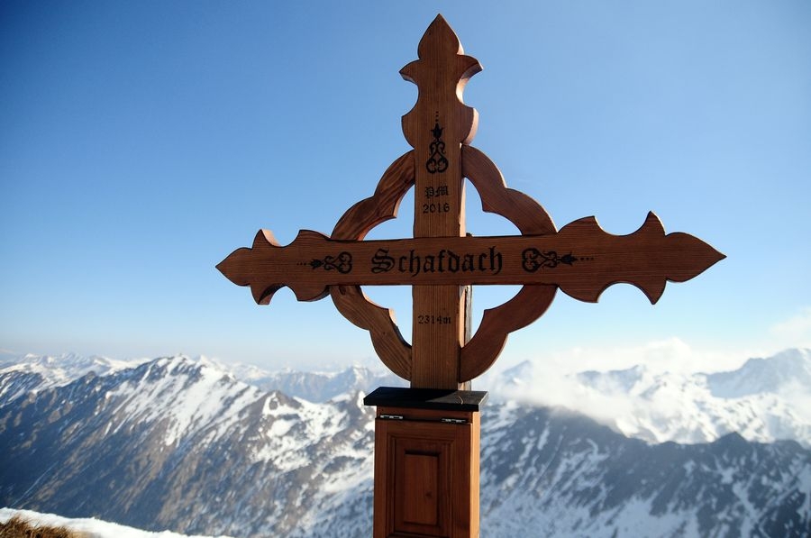 Gemütlicher Wanderausflug war es längst keiner mehr. Teilweise musste ich mich durch Sträucher schlängeln und sogar eine vereiste Schneedecke queren (siehe Bilder) ehe ich endlich ein Gipfelkreuz sah und mich langsam aber doch diesem näherte. Es war allerdings weder der Hochstubofen noch die Rettlkirchspitze sondern das Schafdach. Total egal – denn die Aussicht auf dem kleinen Gipfel war einfach nur grandios. Wolkenfreier Himmel und überall um dich herum nur verschneite Berge – Wanderherz was willst du mehr.