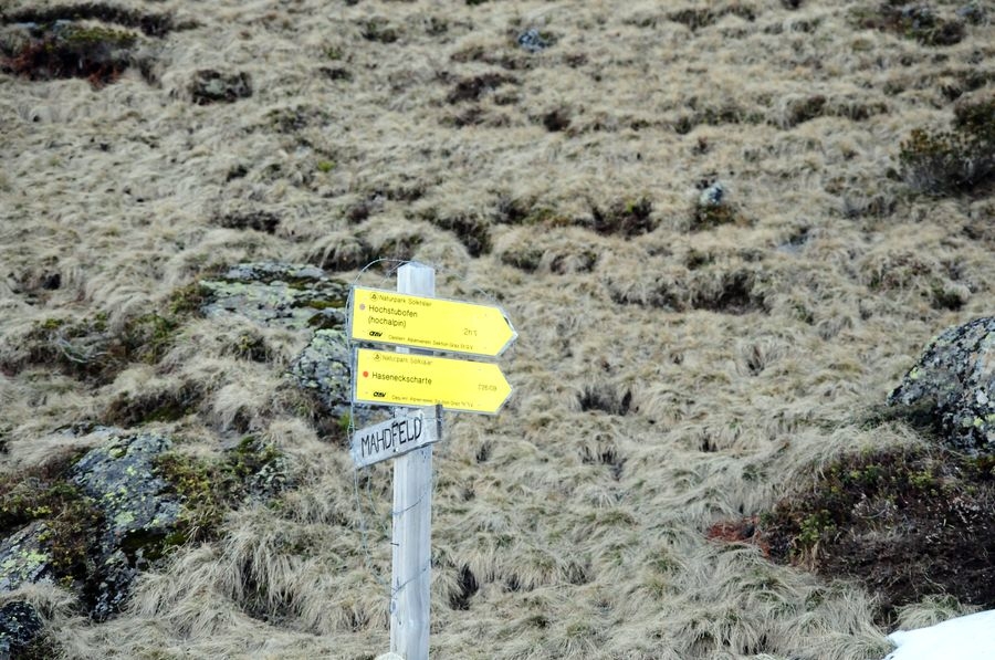 Dann die nächste Überraschung: Laut Routenbeschreibung im Internet sollten es 1:45 Stunden bis zum Hochstubofen sein und weitere 1:15 Stunden bis zur Rettlkirchspitze. Der Wegweiser bei der Winklerkehre sagte allerdings was ganz anderes. 3 Stunden auf hochalpinem Wege bis zum Hochstubofen. Von der Rettlkirchspitze keine Spur. Nicht gerade förderlich für die Motivation. Aber immerhin war ich (noch) auf dem richtigen Weg. Aber nicht mehr lange. Eine halbe Stunde später folgte der nächste Wegweiser (siehe Bilder), dem ich folgte, danach war allerdings aufgrund der Schneemassen kein Weg mehr zu sehen und ich ging einfach nach Gefühl berghoch.
