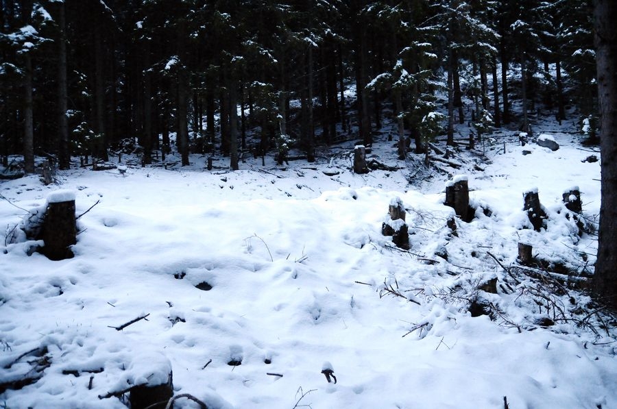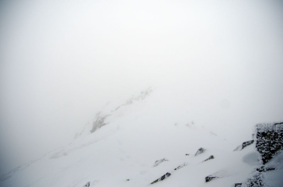 Bis dahin verlief die Wanderung reibungslos, bin ich doch immerhin nicht von der Route abgekommen. Aber nach oben möchte ich nicht blicken. Je weiter es nach oben geht, desto näher komme ich einer dichten Wolken-/Nebeldecke. Einen Gipfel sehe ich die ganze Route nicht. Als ich dann die letzten Bäume passiert habe wird es richtig knifflig. Die Sicht wird immer kürzer und der Wind immer stärker. Meine Handschuhe sind leider schon etwas beschädigt sodass meine Finger sehr schnell zu frieren beginnen. Ansonsten komme ich mit den Bedingungen gut zurecht. Nur voran komme ich nur sehr langsam. Der Schnee geht bis ca. auf die Knie, jeder Schritt kostet ordentlich Kraft. Zumal muss ich immer wieder über leicht vereiste kleine Felsen klettern um am Weg zu bleiben.