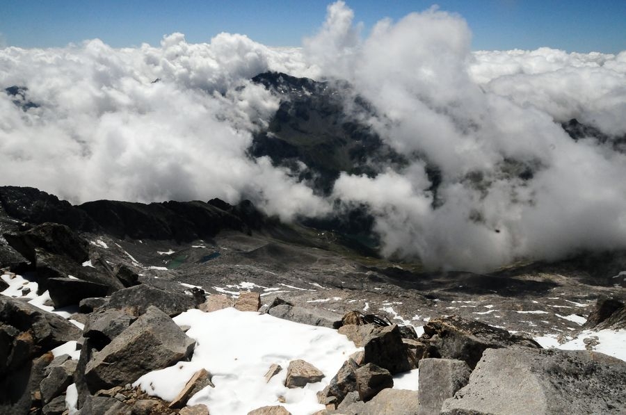 An der Hochalmspitze angelangt erfolgt der Abstieg nun genau über die andere Richtung zum Steinernen Mandln. Man klettert wieder lange entlang des Grates, ehe der seilversicherte Abstieg zum Rudolfstädter Weg (536) folgt. Von dort geht es Anfangs über ein kleines Schneefeld (kann man bei guten Bedingungen super am Hintern runterrutschen) retour Richtung Gießener Hütte. Der Retourweg über Gestein kann sich bei entsprechender Müdigkeit noch ordentlich in die Länge ziehen. Genug Zeitpuffer ist beim Abstieg also einzuplanen. Von der Gießener Hütte geht es auf gleichem Aufstiegswege retour zum Parkplatz.