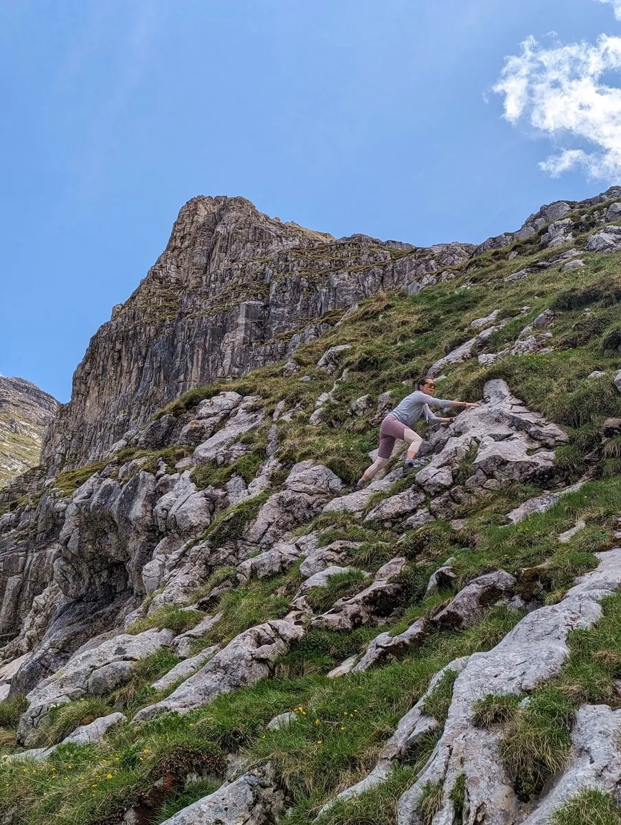 Die ersten zwei Drittel sind einfach, danach ist das felsige Gelände aber deutlich anspruchsvoller. Von unten sieht der Abschnitt aber schwieriger aus, als er es tatsächlich ist. Trotzdem ist in diesem Abschnitt gute Konzentration und Trittsicherheit Grundvoraussetzung. Bei Regen und nassen Verhältnissen kann sich die Schwierigkeit zusätzlich erhöhen.