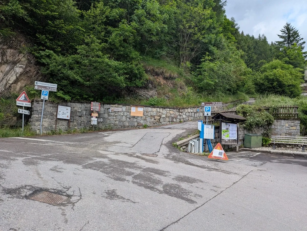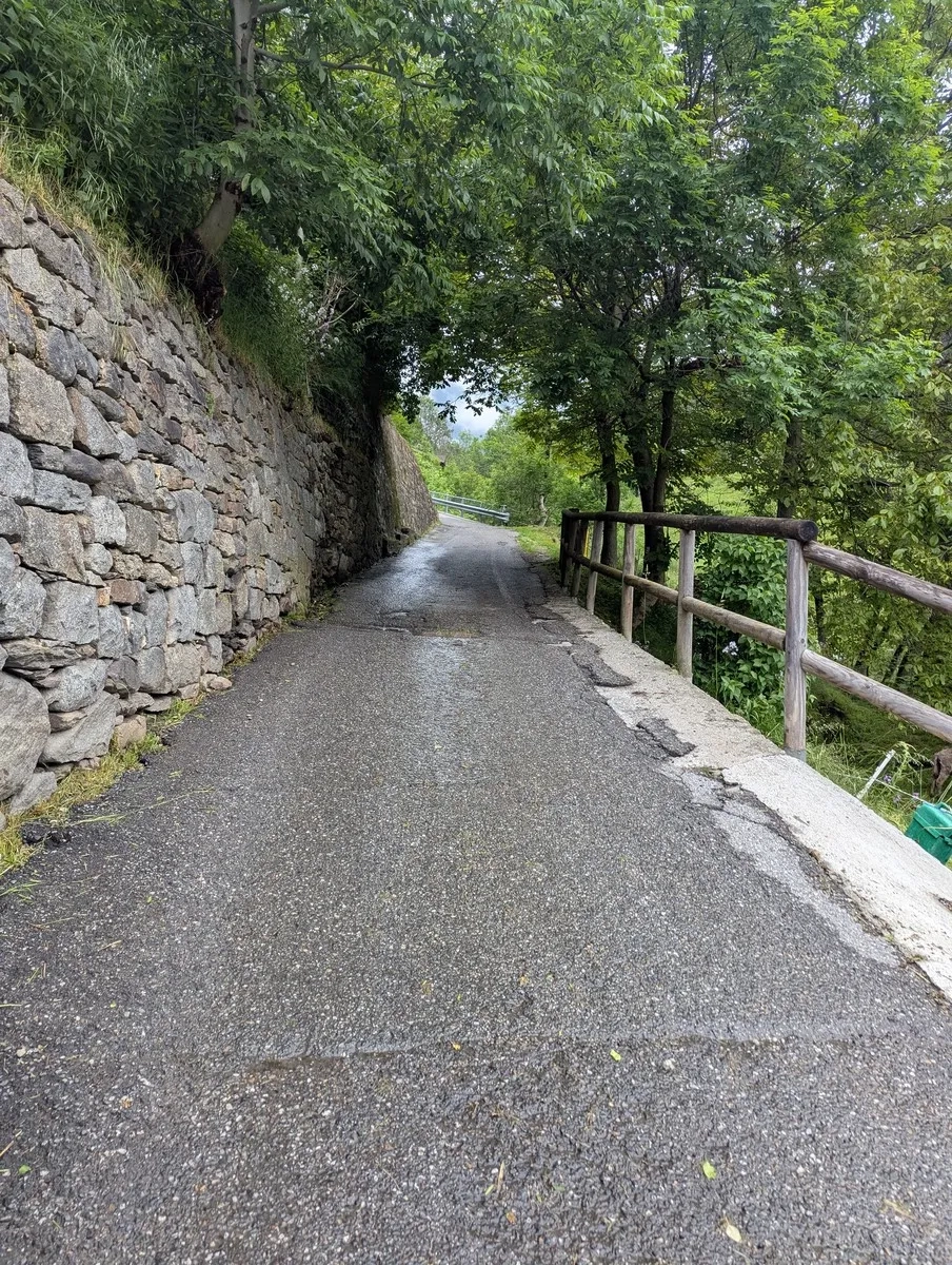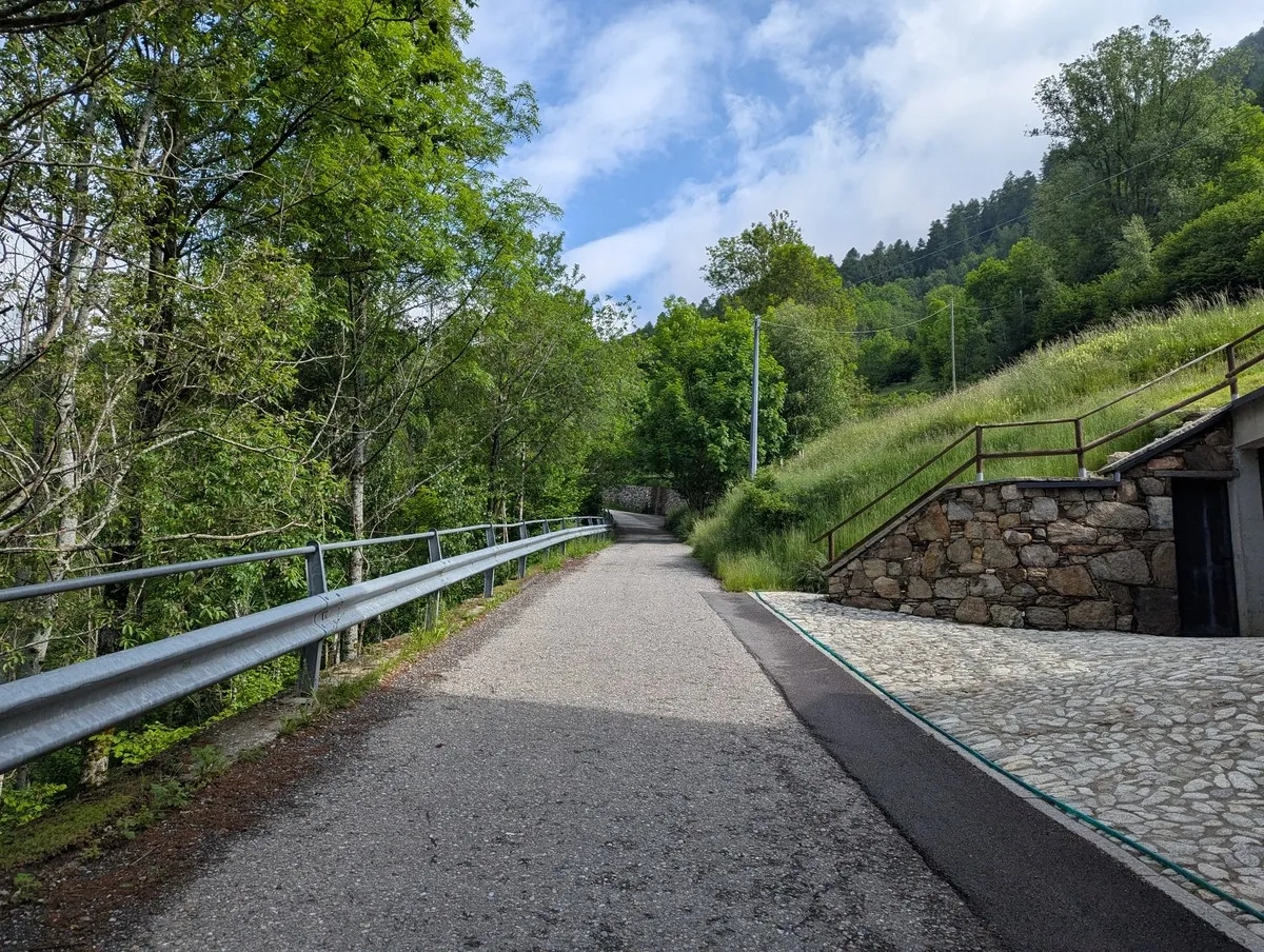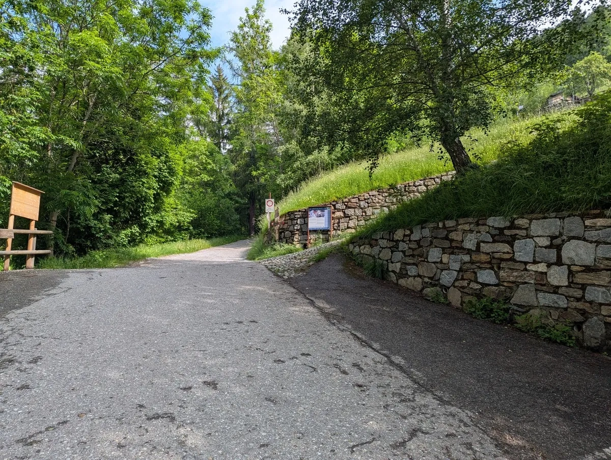 - Los geht's im Zentrum von Vezza d'Oglio. Noch lacht der Asphalt unter den Sohlen – aber das ändert sich bald.