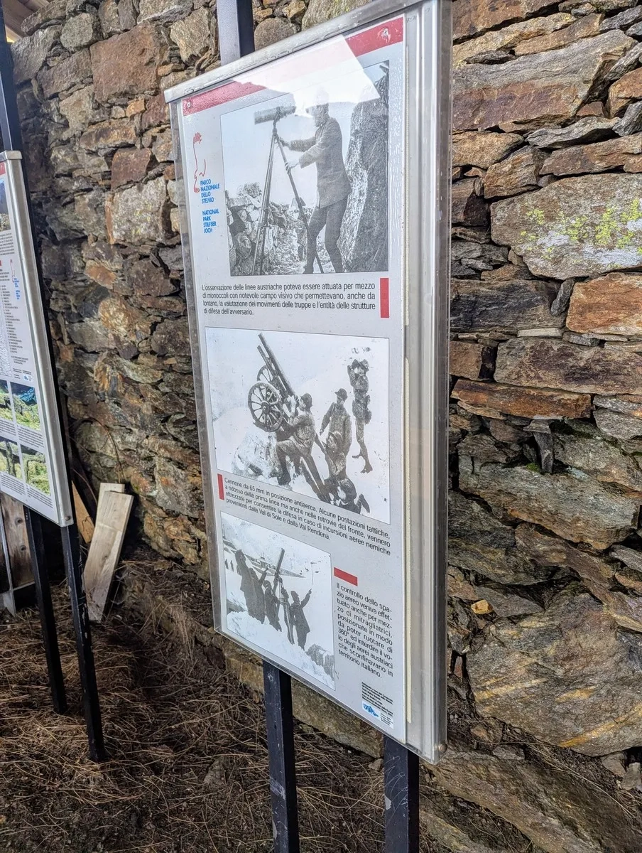 - Ab etwa 2.000 Metern öffnet sich das Gelände. Die Baumgrenze ist erreicht, das Herz schlägt schneller – und das nicht nur wegen der Höhenmeter. Auf ca. 2.400 m erwartet eine alte Kriegsstätte samt Infotafeln auf Italienisch. Wer hier eine Pause einlegt, bekommt nicht nur Luft, sondern auch eine Portion Geschichte serviert.