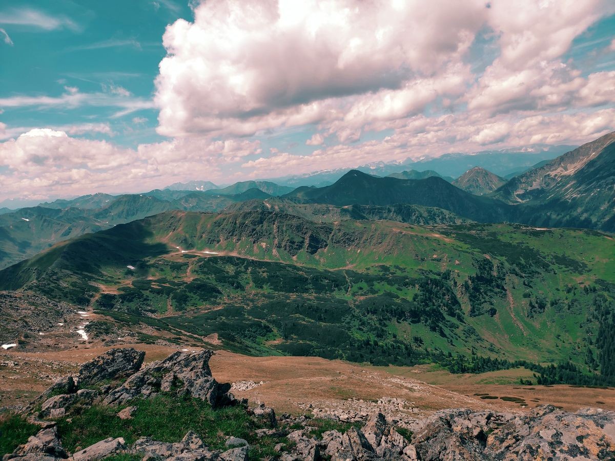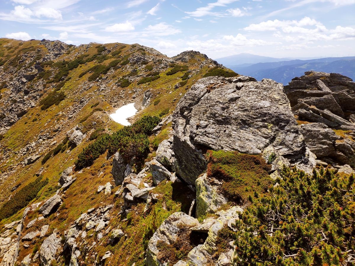 - Nach dem Zinkenkogel beginnt die sehr lange Kammwanderung über den Steinwandkogel und Schüttnerkogel zum Bruderkogel. Am Besten hält man sich immer direkt ganz oben am Grat/Kamm. Oft sind Pfadspuren zu sehen, die aber weiter rechts vom Kamm abweichen und gelegentlich auch plötzlich enden.