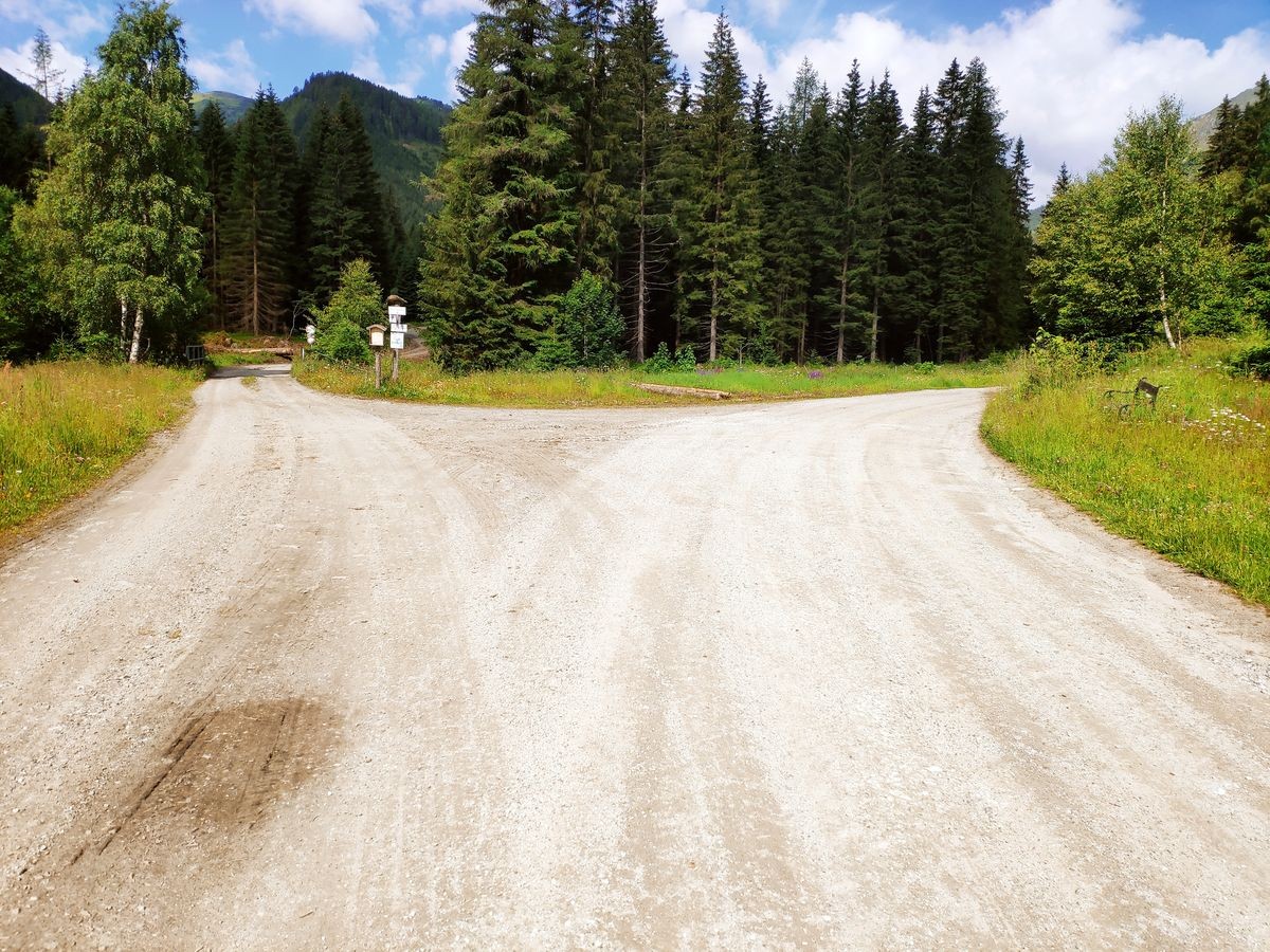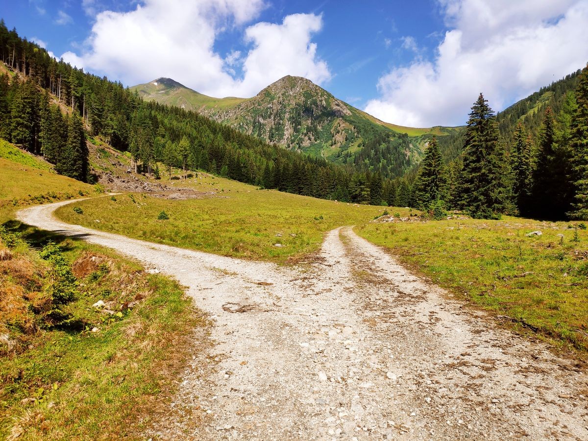 - Nun dem Pölsenweg ein Stück folgen bis die Straße nach links und rechts abzweigt. Man bleibt nun weiter rechts am Pölsenweg. Links würde man auf direktem Wege zum Bruderkogel kommen.