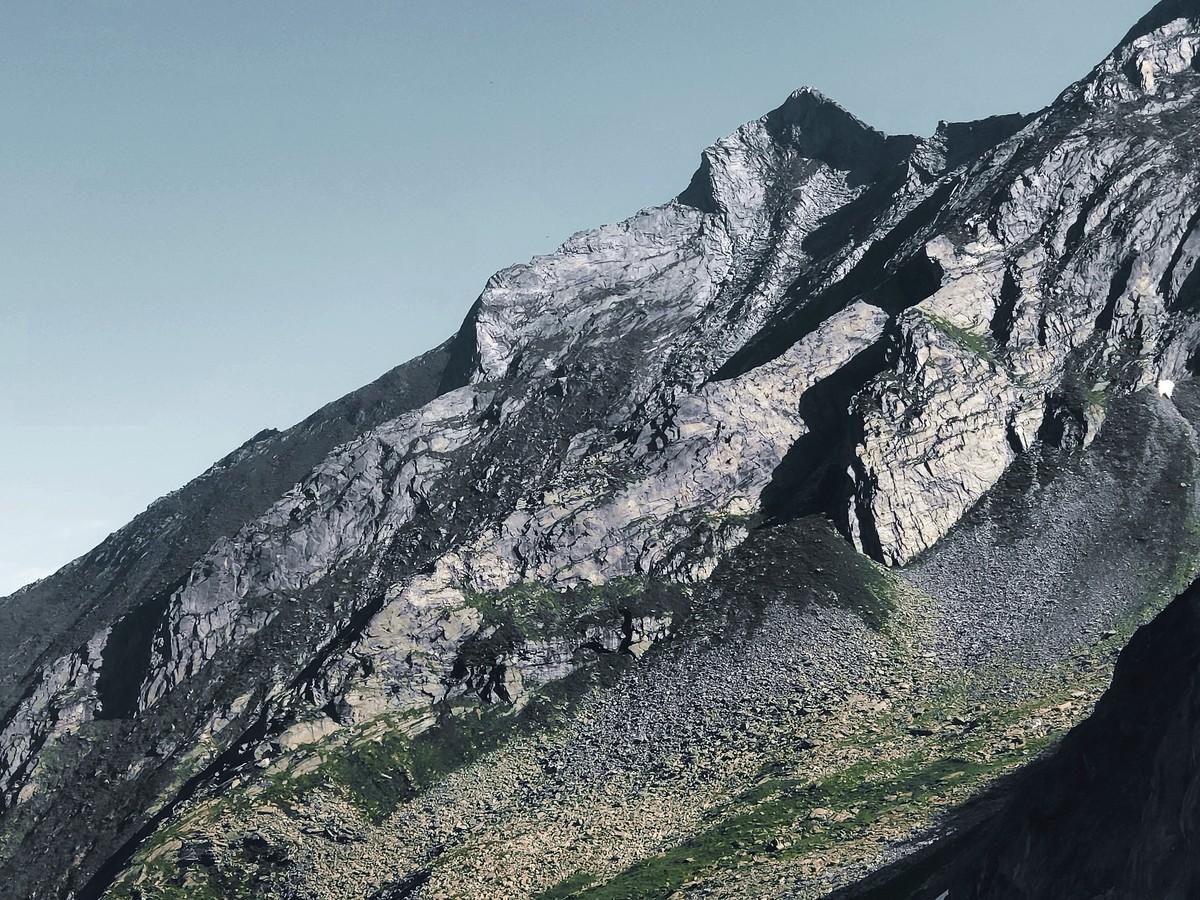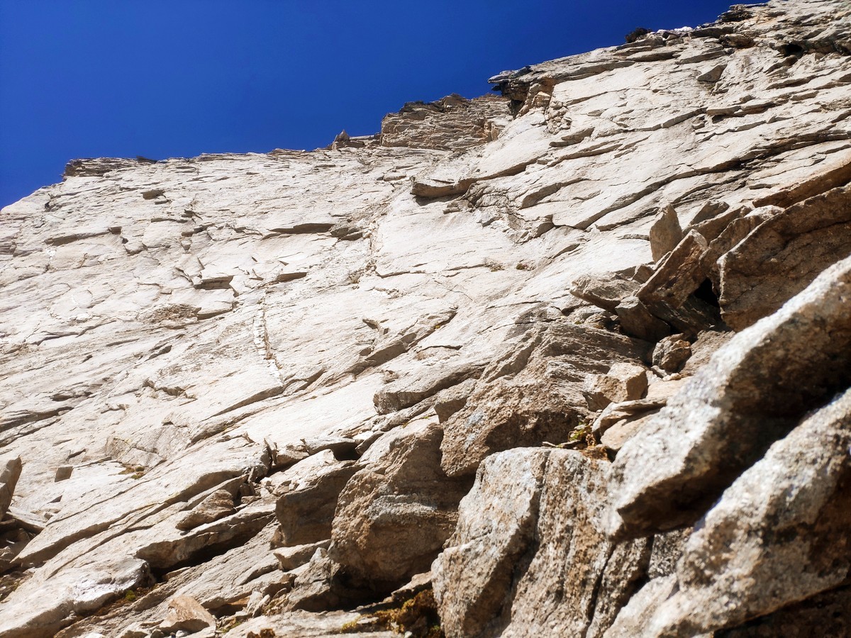 - Danach ist entweder die direkte Linie über den Südgrat (UIAA 5) möglich oder eine lange Querung nach links (Gehgelände bis UIAA 2+) mit abschließender Querung über eine breites Band nach rechts (Gehgelände und kurze Kletterstellen bis 2-).