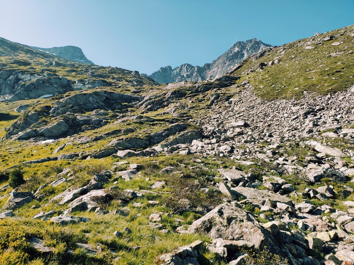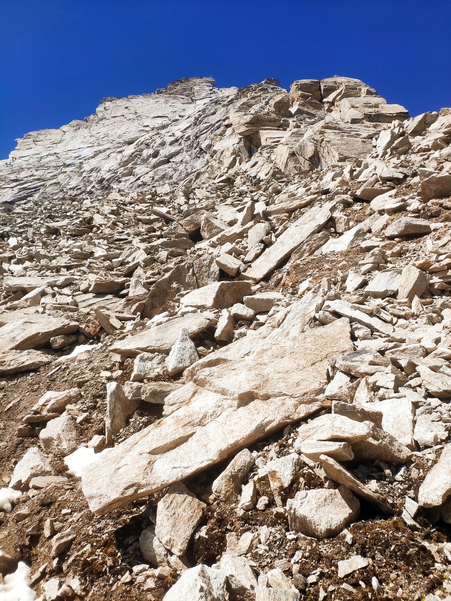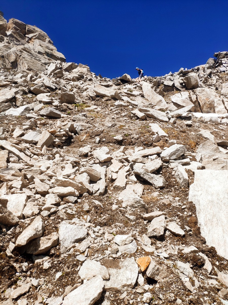 - Von der Feldscharte den ersten Vorbau links im Schutt umgehen.