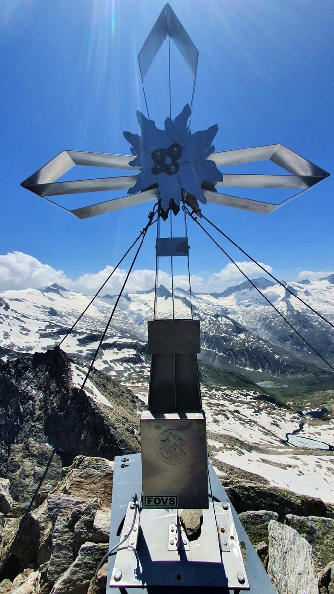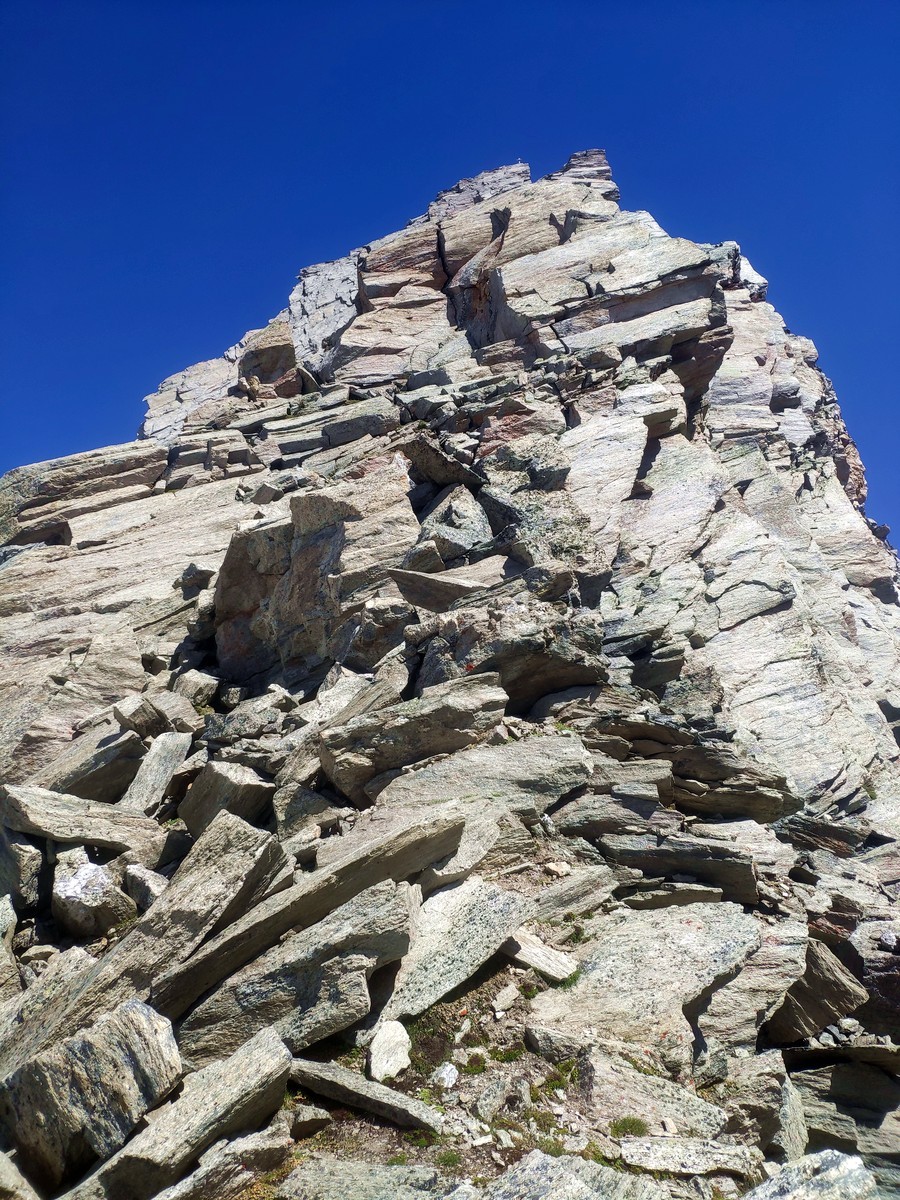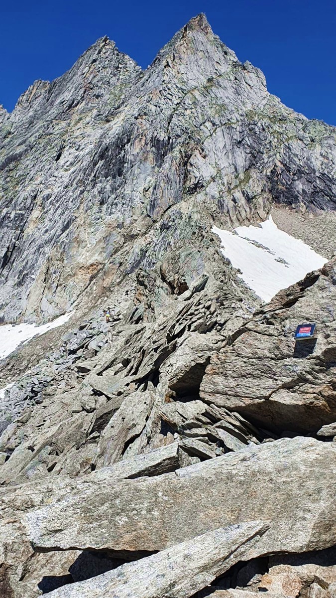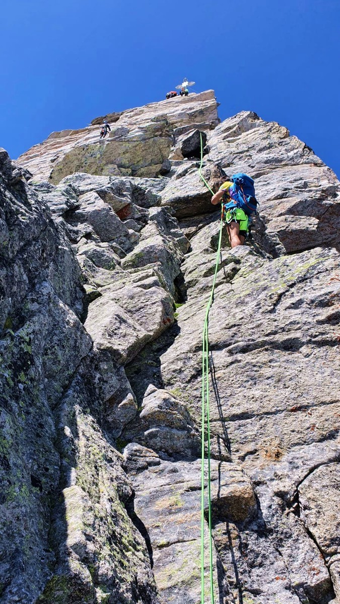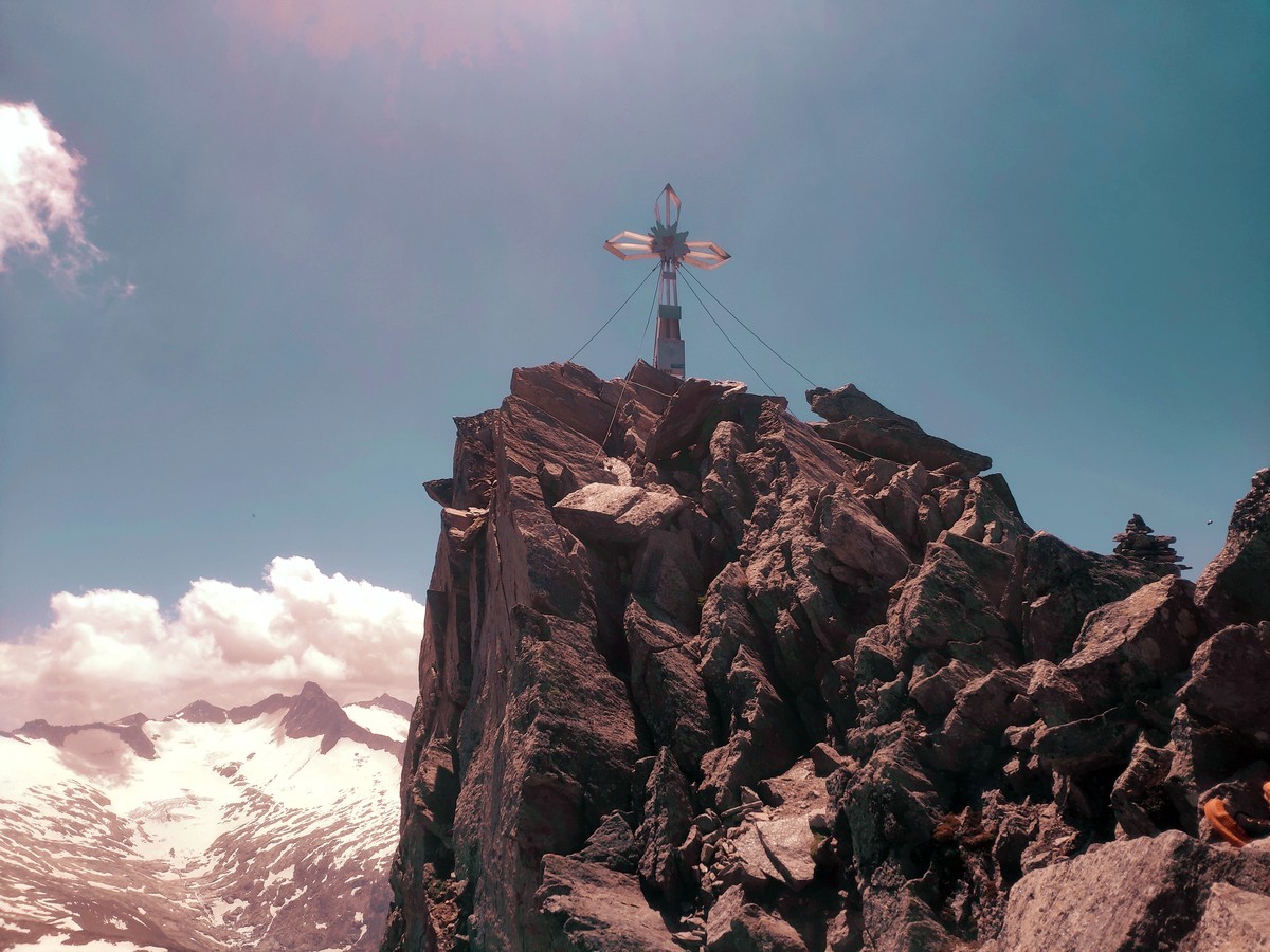 - Für die letzte Seillänge zur Zsigmondyspitze gibt es wieder zwei Varianten. Entweder der direkte Anstieg zum Gipfelkreuz mit UIAA 4 oder einfaches Klettern über Blockwerk rechts vom Gipfelkreuz mit UIAA 2.