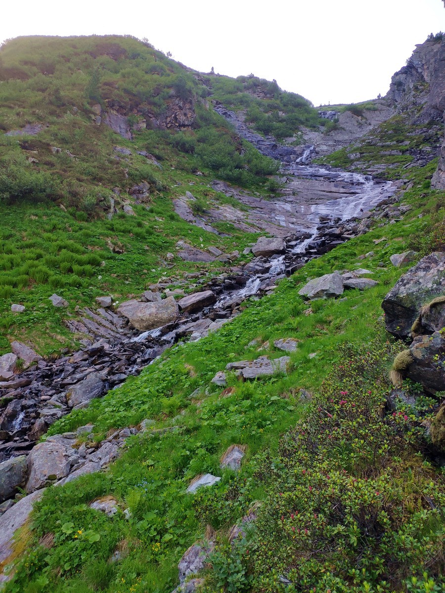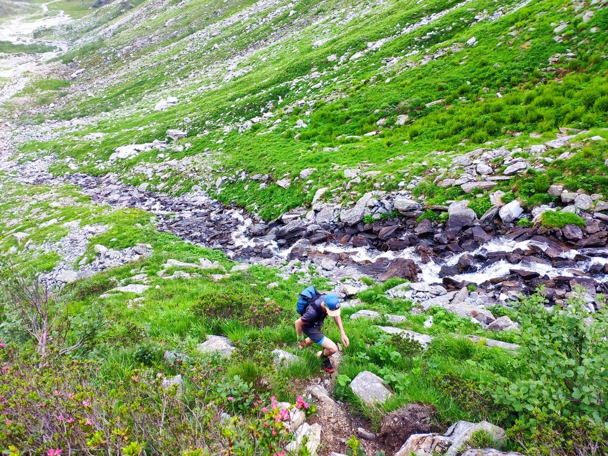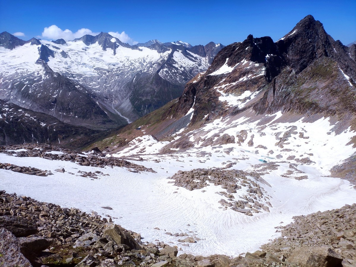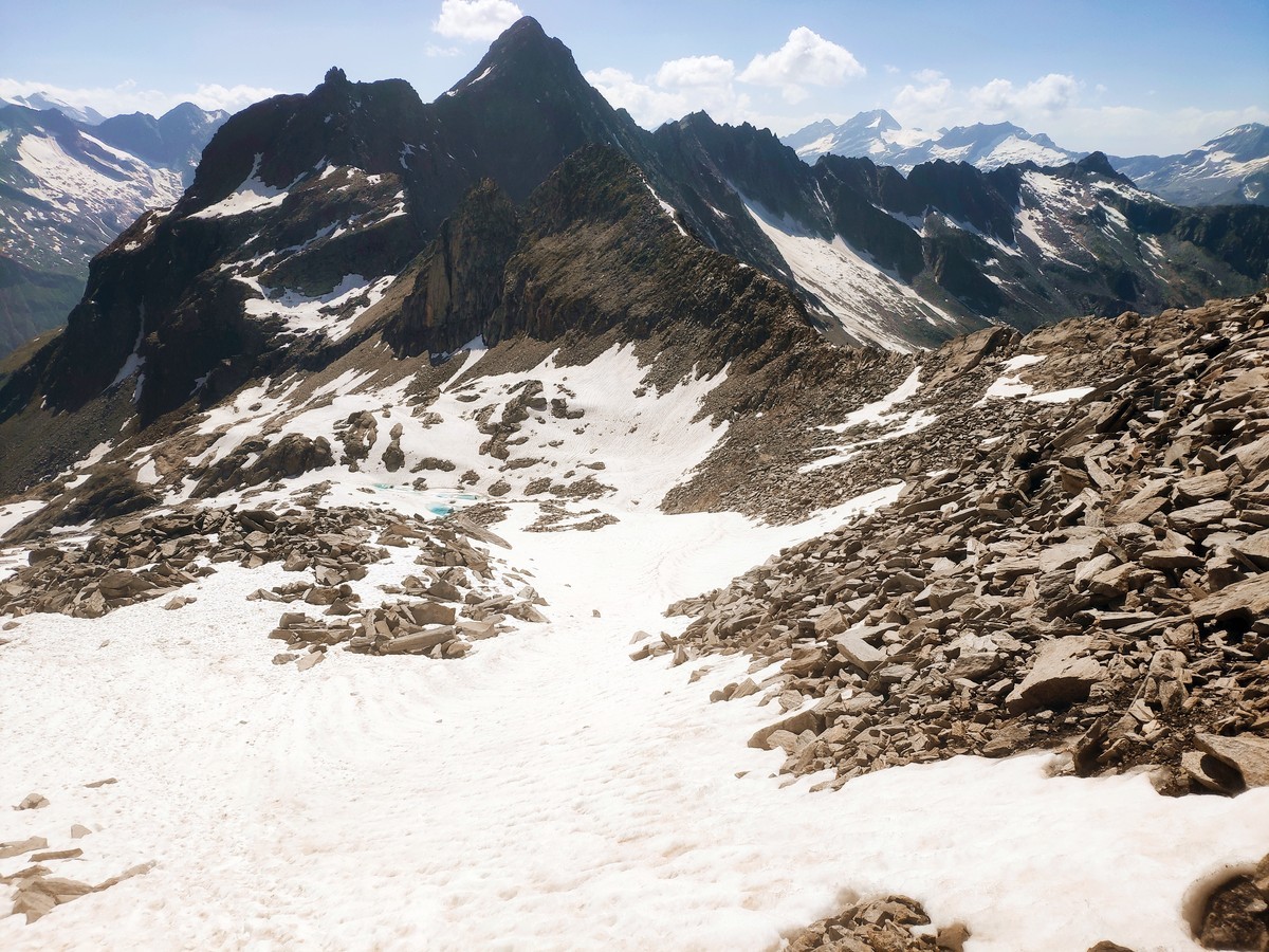 - Nun folgen knapp 100 Höhenmeter Abstieg bis man kurz vor dem Eissee auf den Weg von der Berliner Hütte und der Greizer Hütte trifft.