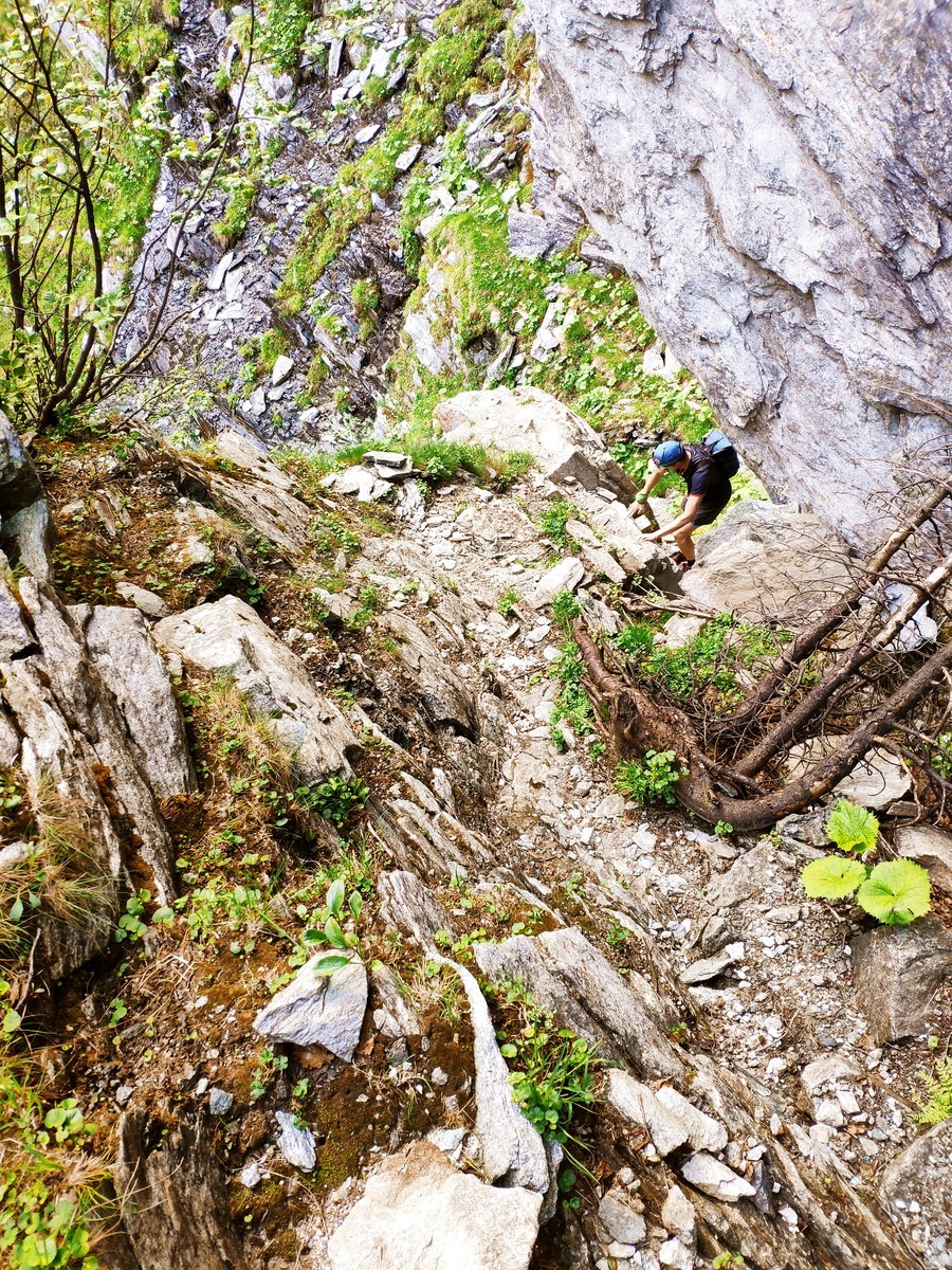 Zustiegsschuhe oder leichten Trailschuhe (guter Grip Voraussetzung) sind aufgrund des langen Wanderweges gegenüber festen Bergschuhen zu bevorzugen. Voraussetzung natürlich ist sicheres Klettern mit diesem Schuhwerk.