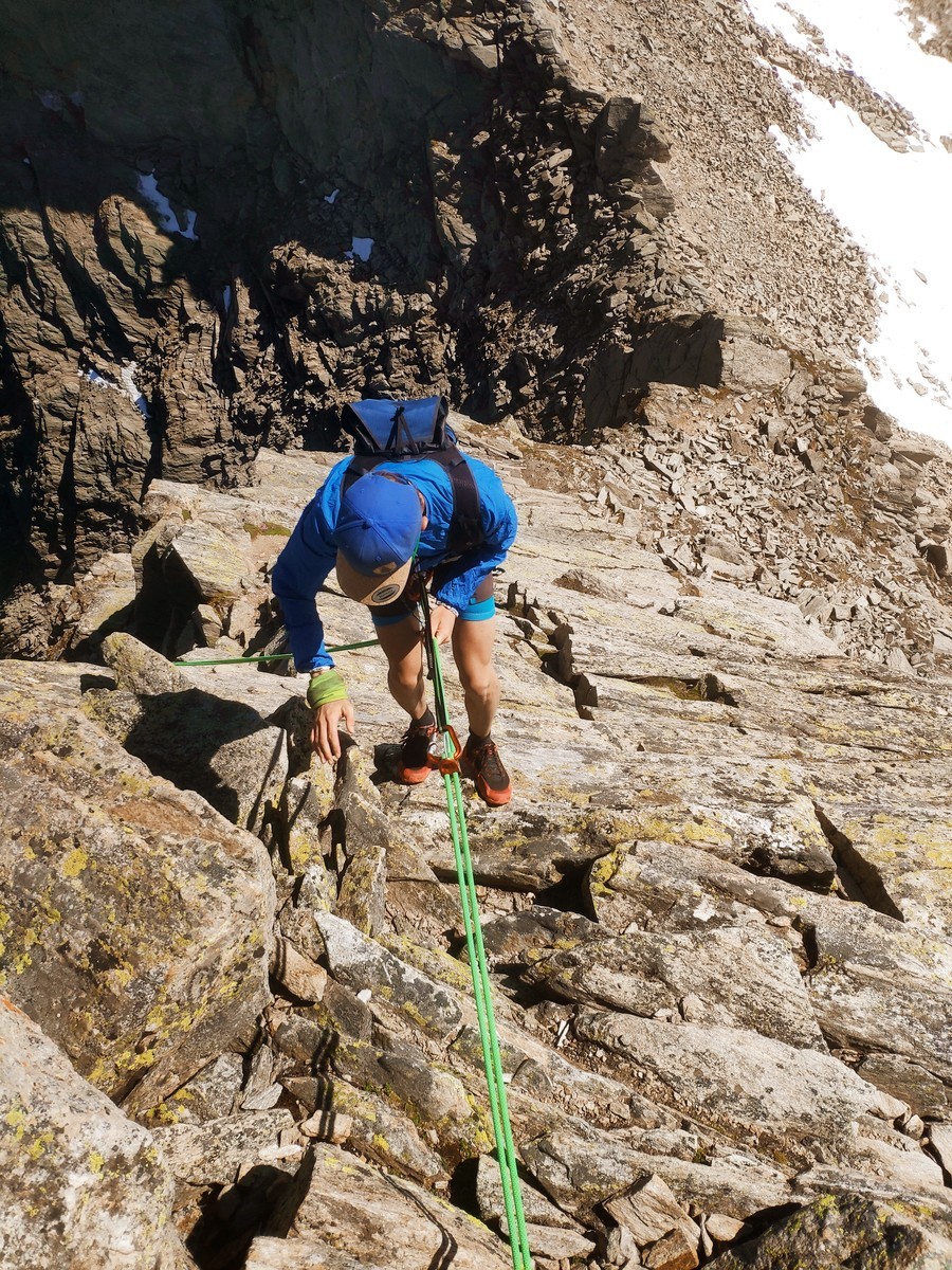 - Mit einem 60-Meter-Seil über den Südgrat abseilen.