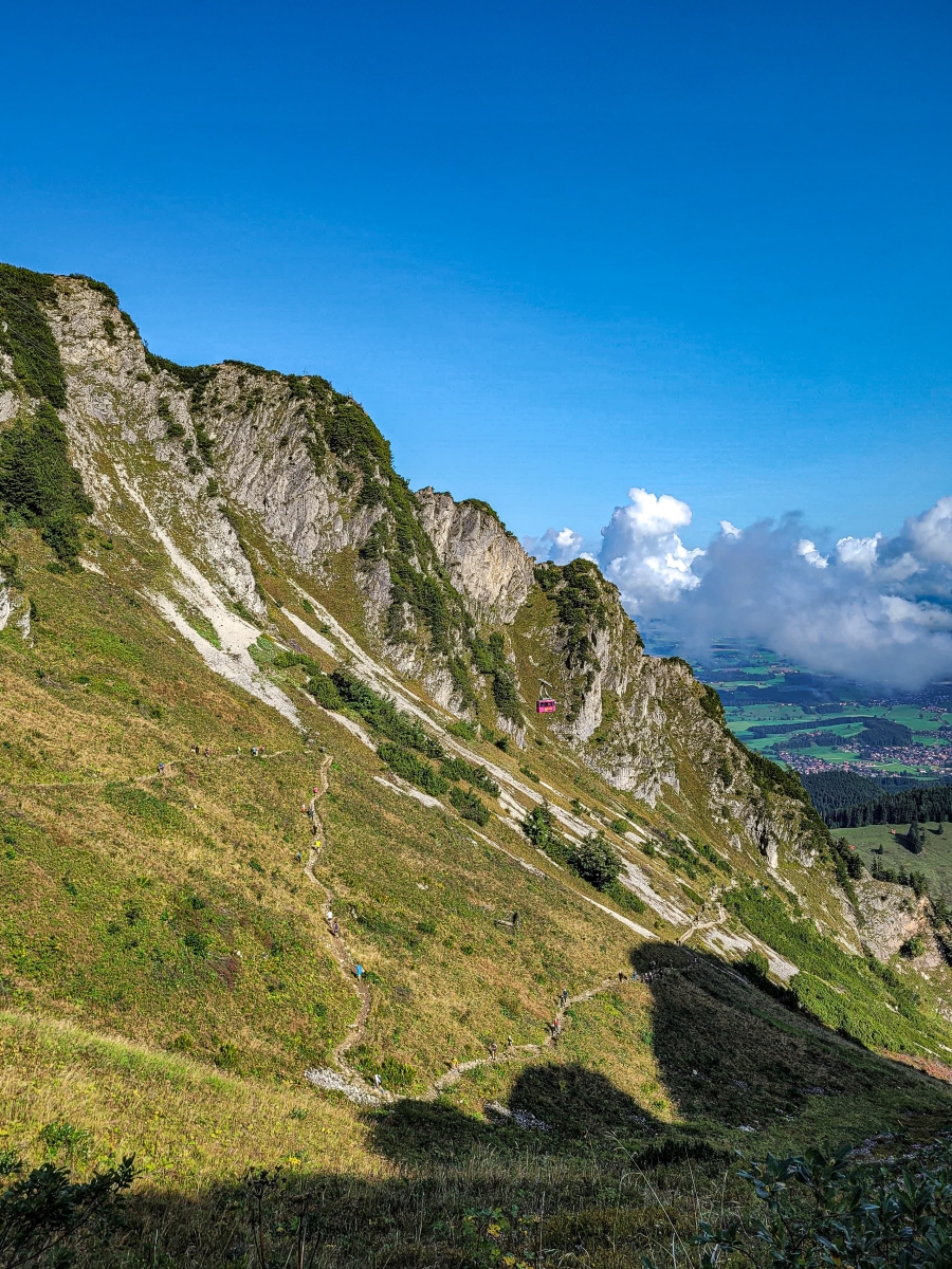 Beide Abschnitte von der Tal- zur Mittelstation (5,7km) und von der Mittelstation zum Gipfel (3,9km) überbrücken jeweils 590hm.