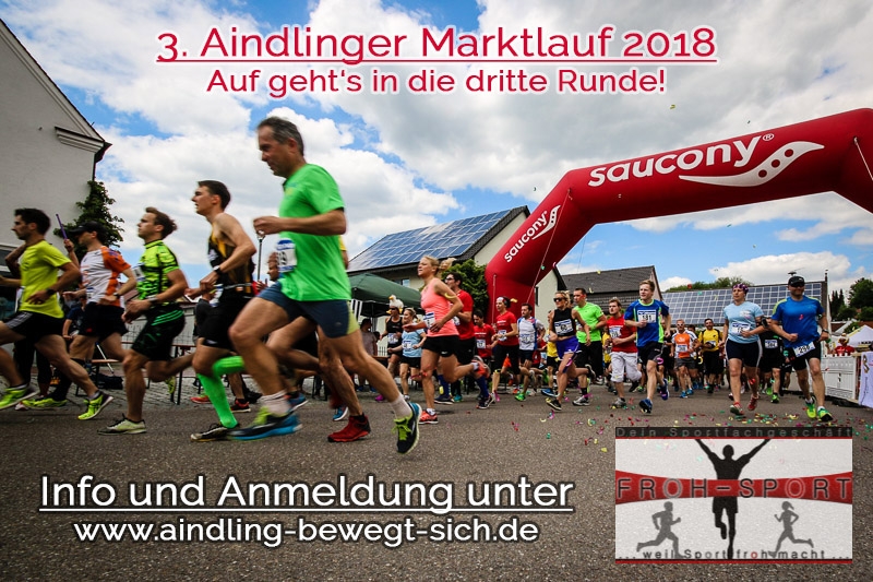 Der Aindlinger Marktlauf ist eine seit 2016 durchgeführte Laufveranstaltung im Herzen von Aindling. Du hast die Möglichkeit an verschiedenen Läufen teilzunehmen und dein Können unter Beweis zu stellen. Für unsere Zuschauer haben wir außerdem ein buntes Rahmenprogramm vorbereitet. Zu guter Letzt gibt's noch eine Siegerehrung mit Verlosung. Verhungern oder verdursten muss bei uns keiner - wir haben auch hier vorgesorgt.