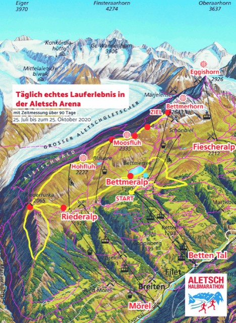 Der Start befindet sich auf einer Höhe von 1.950 Metern bei der Bergstation der Bettmeralpbahn. Bei keinem anderen Halbmarathon in Europa wird auf so einer Höhe gestartet.