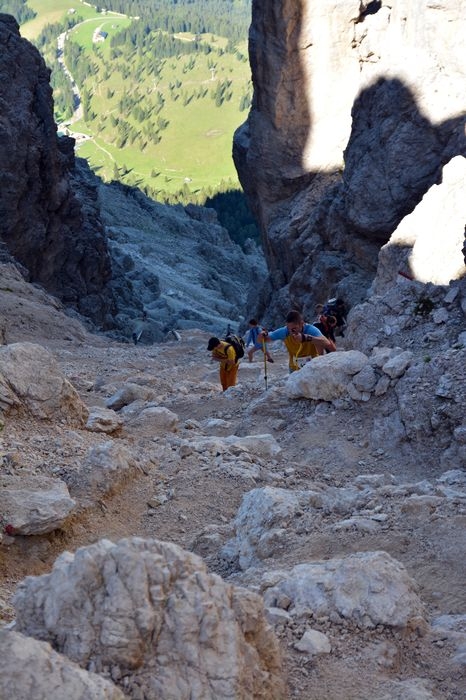 Start is at 09.00 a.m. at the Frommer Alm - 1.743 m above sealevel, the route passes the Kölner Hütte – Laurins Lounge and arrives at the Passo Coronelle, 2.630 m above sealevel.