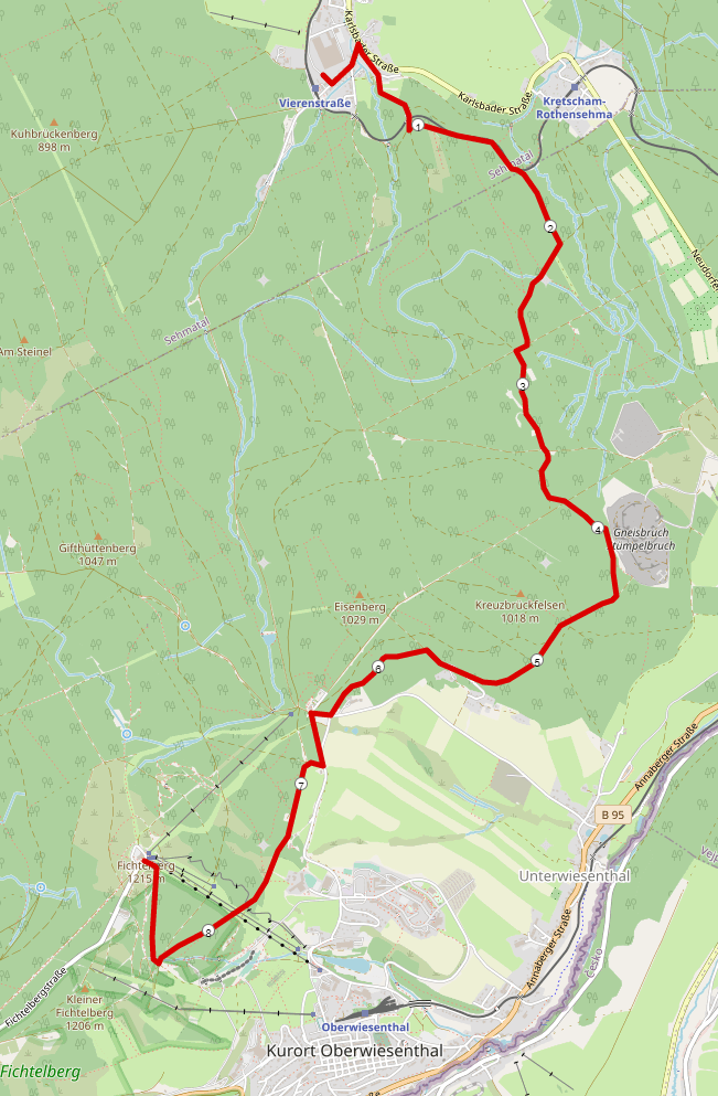 Streckenführung: Vierenstraße – Wiesenweg – Gelber Weg – Flößzechenweg – Bärenfangweg – Rotes Vorwerk – Philosophenweg – Wasserweg – Eckbauer – Skiheimstraße (neu) – Plateau Fichtelberg