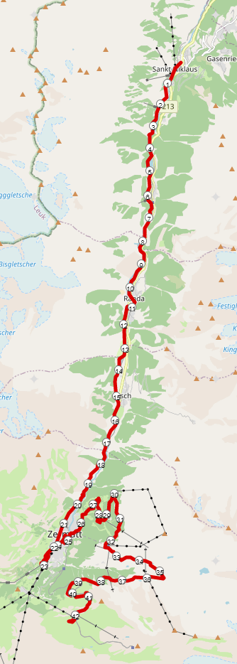 Der Lauf beginnt in St. Niklaus auf einer Höhe von 1.116 Metern und führt über Zermatt auf die Riffelalp auf einer Höhe von 2.222 Metern.