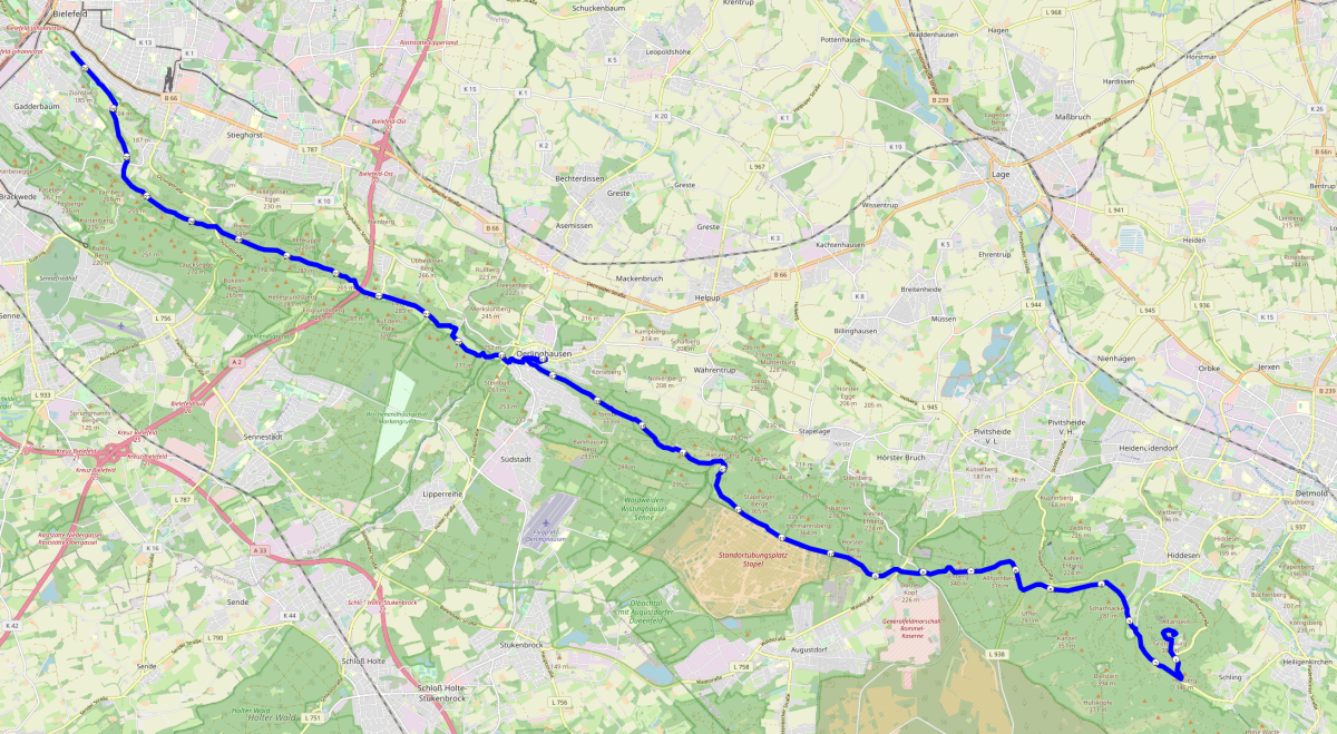 Strecke: Anspruchsvoll und profiliert auf Waldboden mit 515 positiven und 710 negativen Höhenmetern vom Hermannsdenkmal bis zur Sparrenburg.
