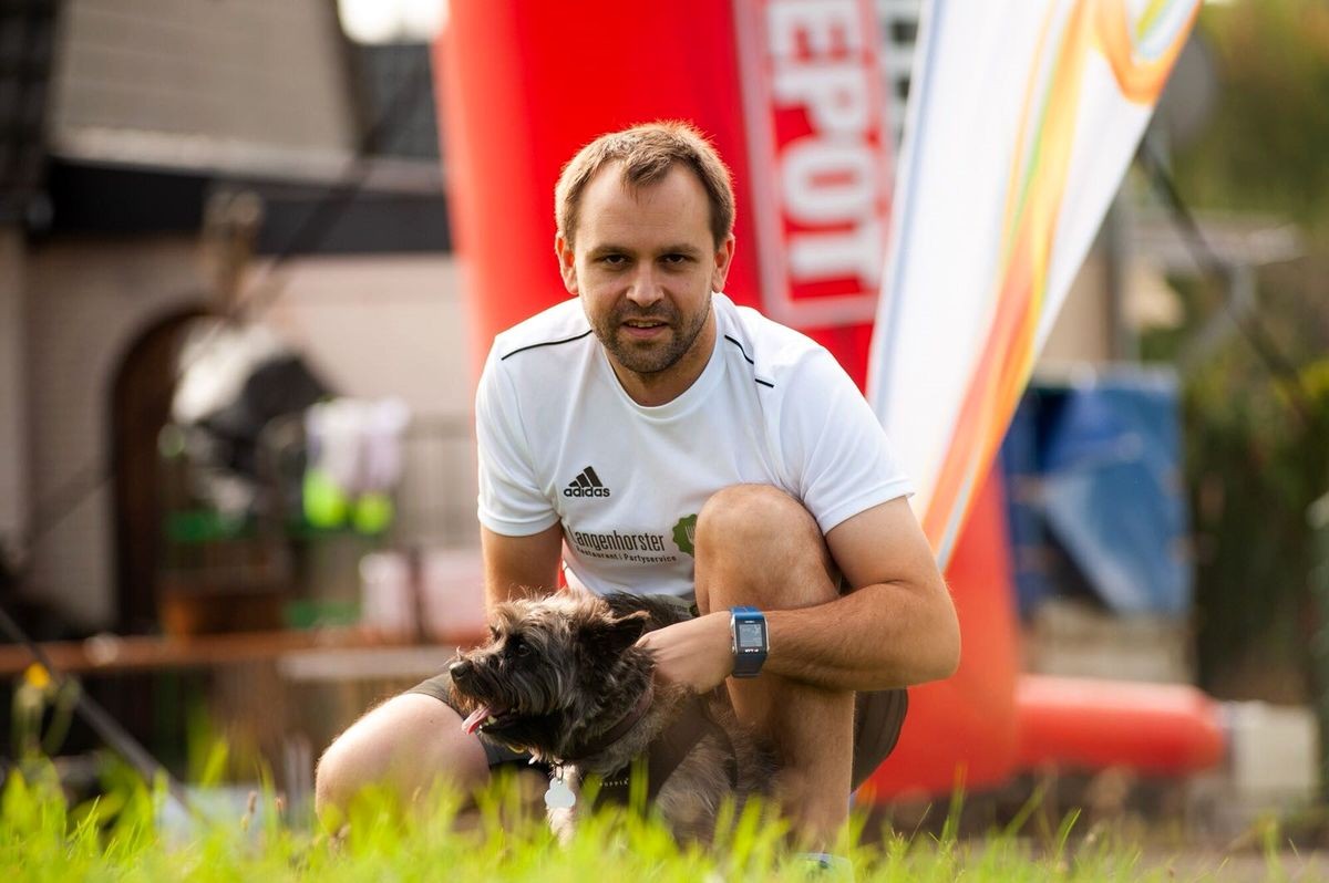 Toller Lauf mit Hund ins Ziel laufen ist wunderbar