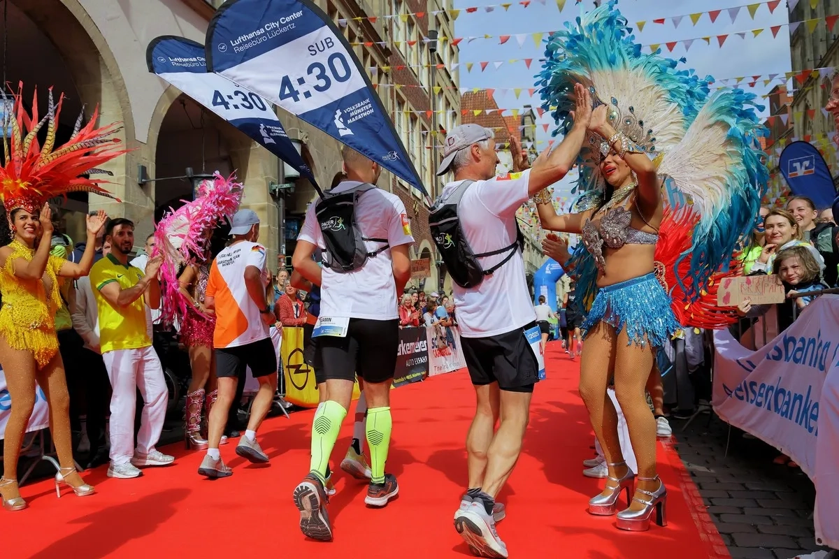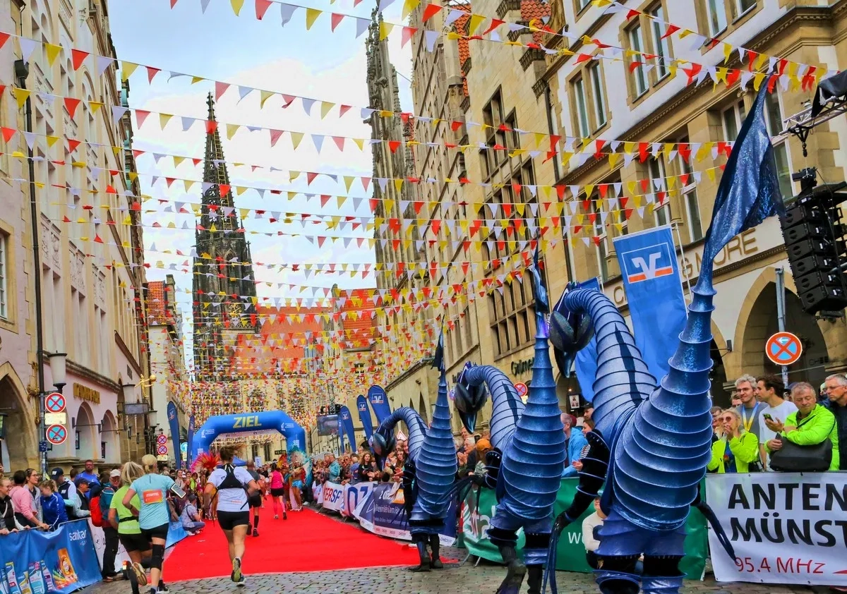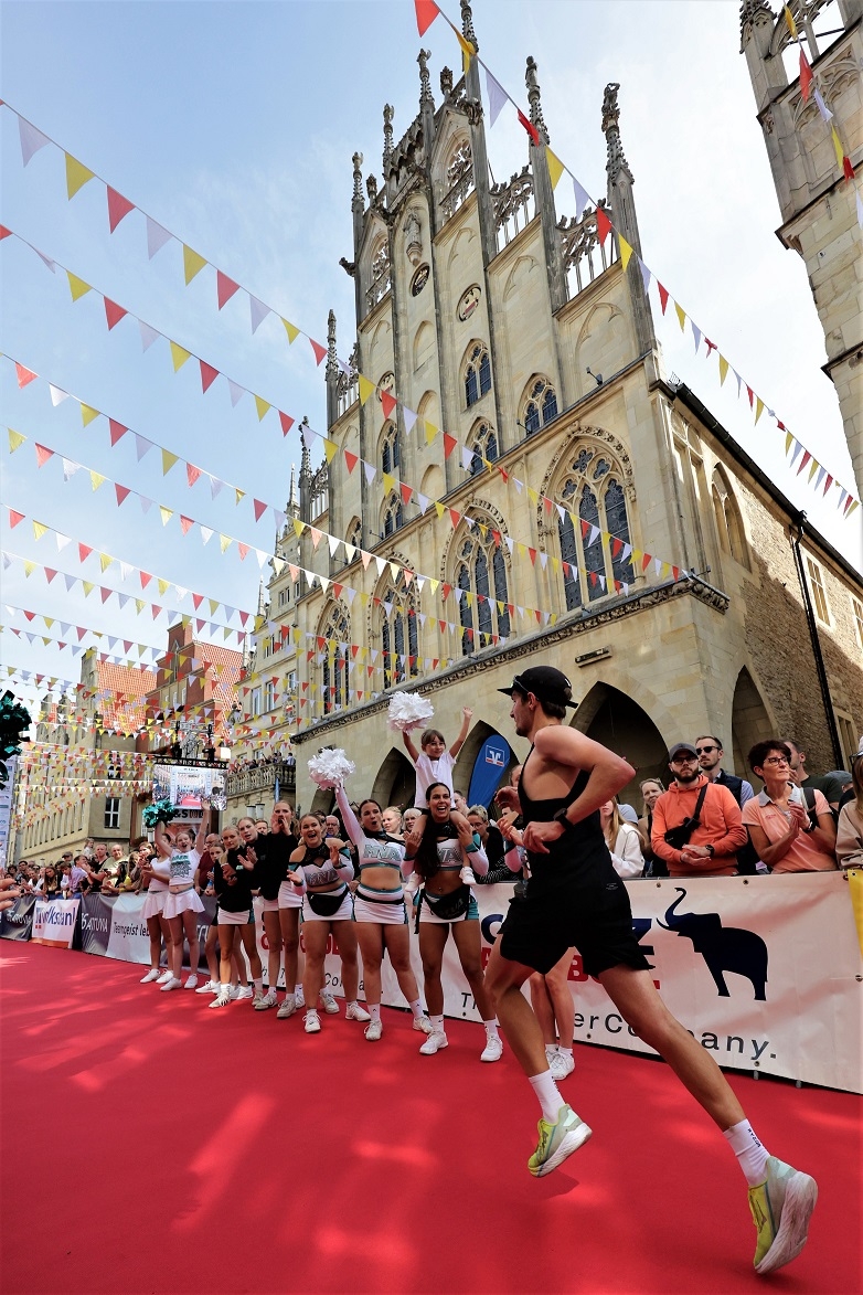 Der Volksbank-Münster-Marathon gehört seit Jahren zu den Highlights für Enthusiasten, für diejenigen Marathonläufer, die Party an der Strecke mögen, die gefeiert werden möchten, die Gänsehautstimmung genießen wollen und einen Zieleinlauf erleben, der in Deutschland seinesgleichen sucht. Umjubelt von zigtausend Zuschauern auf Münsters beflaggtem Prinzipalmarkt und einem roten Teppich sowie Künstlern, die über sich hinauswachsen.