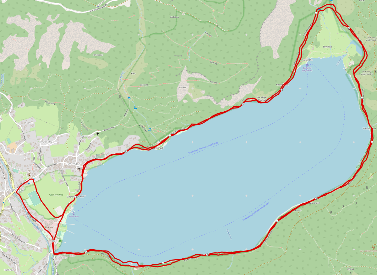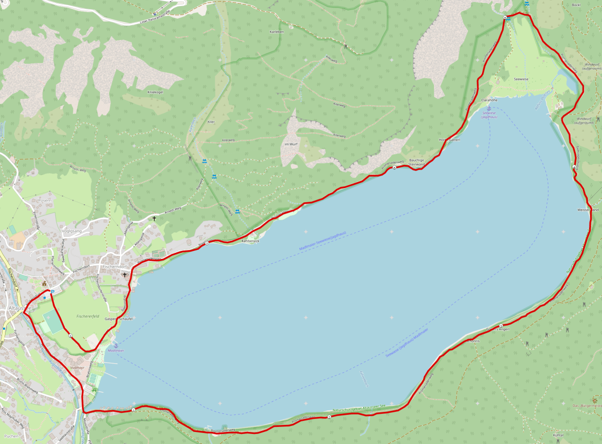 Streckenführung Lauf: Start und Ziel Volkshaus Altaussee, Start und die ersten 500 m auf Aspha(Laufbewerbe) dann ca. 6.500 m nicht asphaltierter bis zu 2 m breiter Promenadenweg um den See, danach ca. 800 m Asphalt, die letzten 300 m vor dem Ziel nicht asphaltierter Wanderweg. Die Strecke ist eben geführt und weist nur sehr geringe Höhendifferenzen auf.