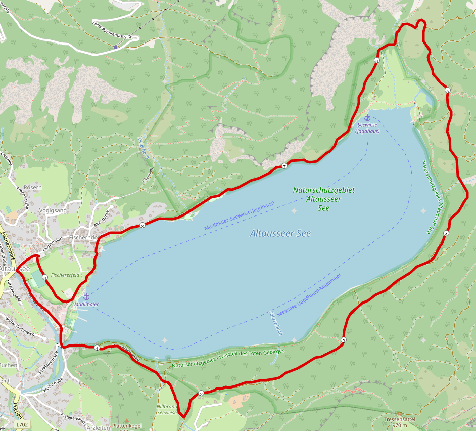 Streckenführung Nordic Walking: Start und Ziel Volkshaus Altaussee, Start und die ersten 500 m auf (Nordic Walking) Asphalt, dann ca. 8.500 m zum Teil nicht asphaltierter Promenadenweg, zum Teil Forststraße (Schotterstraße) um den See, danach ca. 800 m Asphalt, die letzten 300 m vor dem Ziel nicht asphaltierter Wanderweg. Die Strecke weist beim Übergang vom Promenadenweg zur Forststraße eine leichte Steigung mit einer Höhendifferenz von ca. 150 m auf.