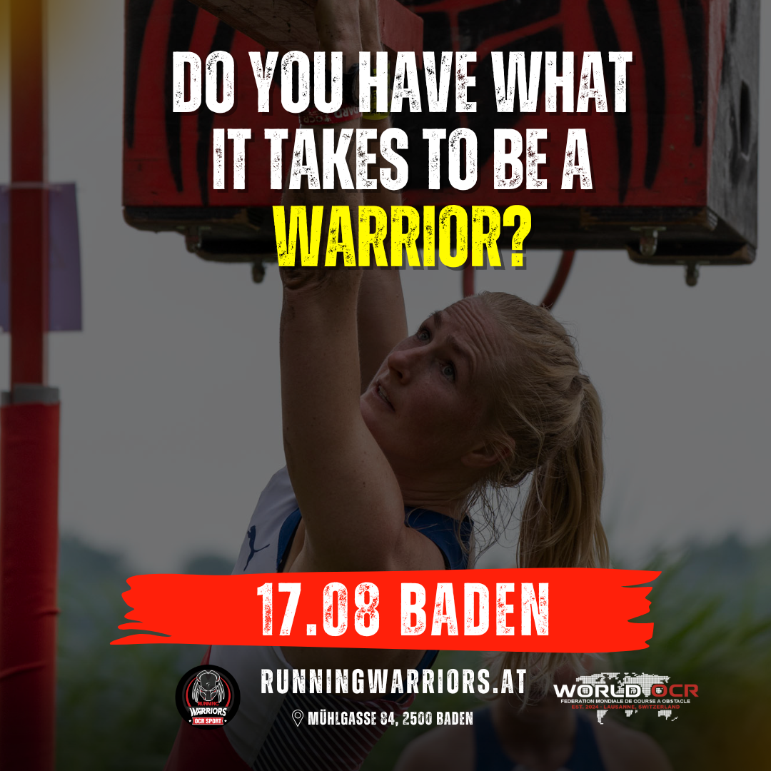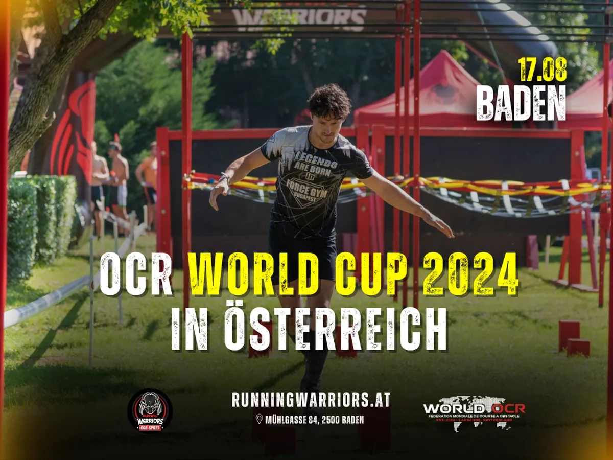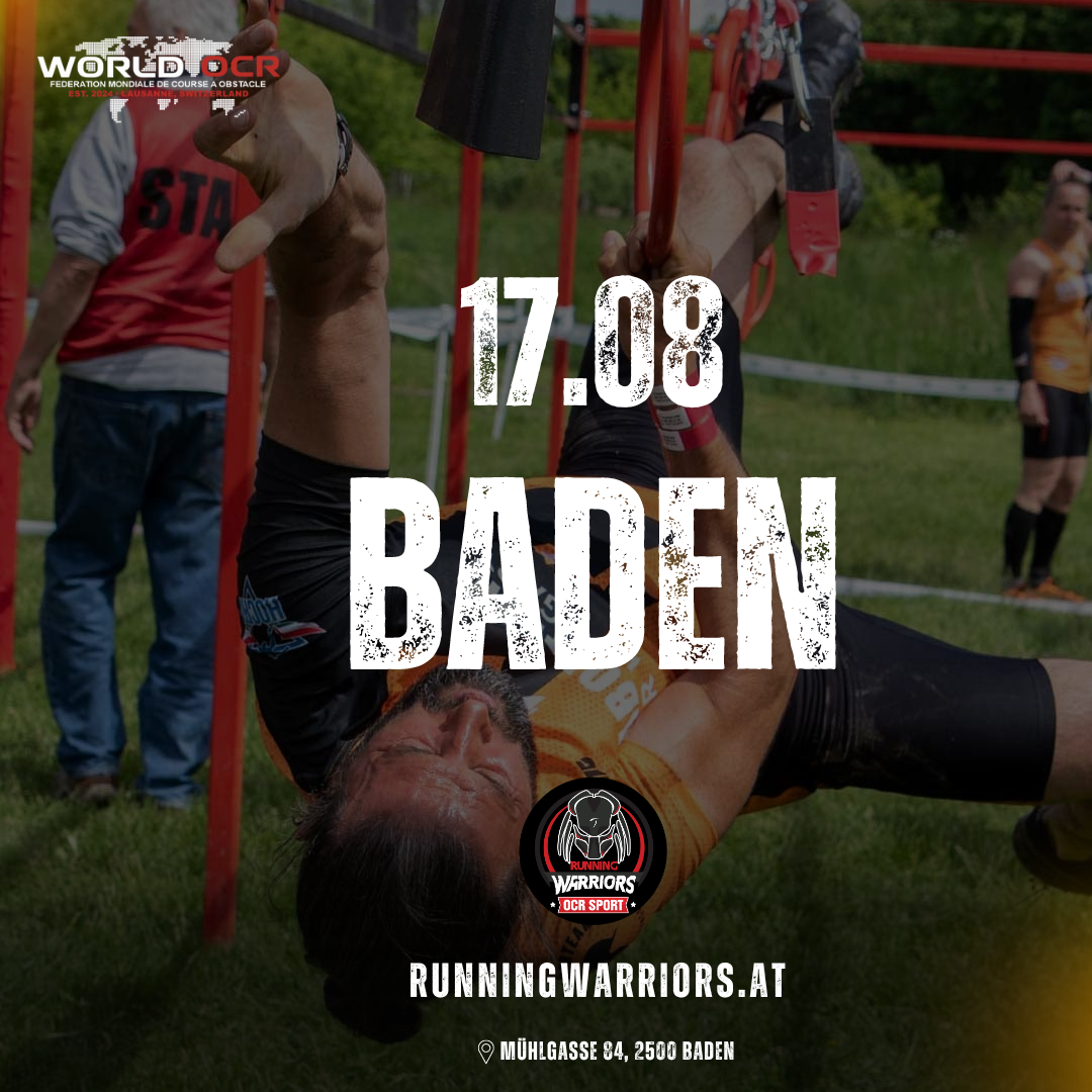 Der erste OCR (Obstacle Course Running) World Cup in Österreich findet am 17. August 2024 auf der Trabrennbahn in Baden statt. Dieses Event, unterstützt von World OCR, dem eingetragenen internationalen Fachverband, umfasst drei Kategorien: Elite (3 km, 20 Hindernisse), Age Group (3 km, 20 Hindernisse, ab 12 Jahren) und Open (5 km, 25 Hindernisse, für alle Fitness-Level, auch Teamstarts möglich). Exakte Zeitmessung erfolgt durch ein Zeitchip-System. Anmeldung und weitere Informationen sind auf der Webseite von Running Warriors verfügbar.