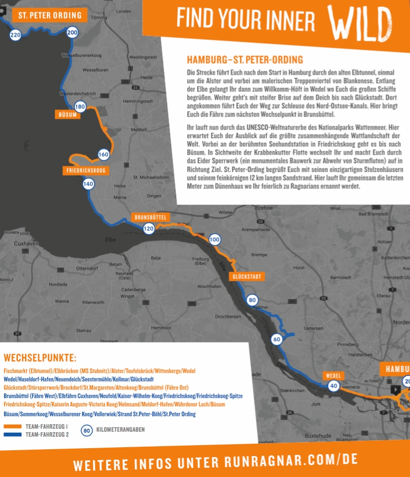 Start in Hamburg (Hafenstraße), Ziel: St. Peter-Ording, Ortsteil Bad, Seebrücke/Dünenhus