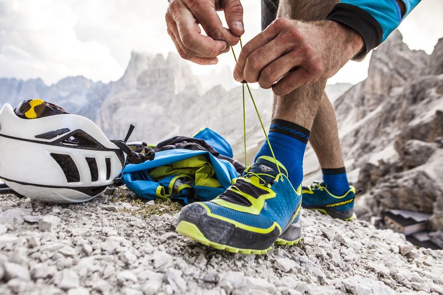 Die notwenige Stabilität erhält der Fuß durch eine verdichtete und komprimierte EVA Mittelsohle, die durch einen speziellen Aufbau besticht und eigens für den DYNAFIT Speed MTN Schuh entwickelt wurde. Der Heel Preloader, eine diagonale Verstärkung an der Ferse, sorgt zudem für eine bessere Passform und mehr Komfort im hinteren Fußbereich. Um den Fuß in steinigem, alpinen Terrain optimal zu schützen und den Schuh dabei besonders langlebig zu machen, ist der DYNAFIT Speed MTN Transalper aus sehr abriebfestem Tech Leather gefertigt. Das ballistische Material im Bereich des Vorderfußes enthält Aramidfasern für noch mehr Widerstandsfähigkeit. Zudem besitzt das Modell einen rundum laufenden Geröllschutz. Ins Gewicht fallen die robusten Eigenschaften des Schuhs jedoch nicht, vielmehr gehört er mit weniger als 400 Gramm zu den leichtesten Modellen seiner Klasse. Hierfür verantwortlich ist mitunter die spezielle Strickkonstruktion des ballistischen Gewebes, das nicht nur besonders wenig wiegt, sondern auch für eine optimale Luftzirkulation und somit für ein angenehmes Fußklima sorgt.