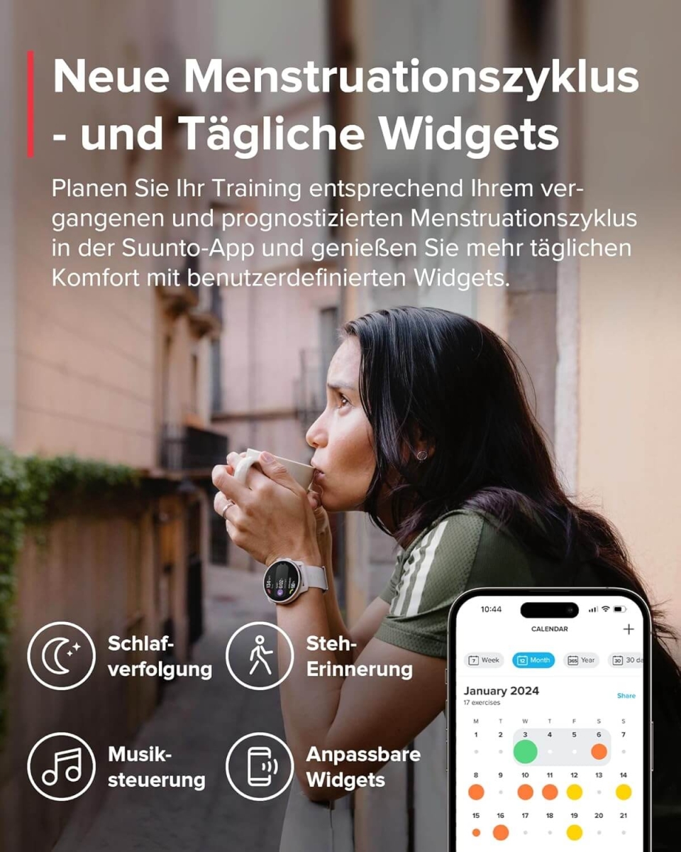 Mit personalisiertem Feedback zur Trainingsbelastung und Erholung können Sie gezielt Ihre Fortschritte verfolgen. Die Suunto Coach KI bietet wertvolle Tipps zur Motivationssteigerung und ermöglicht den Vergleich Ihrer Daten mit Menstruationszyklen über die Suunto App.