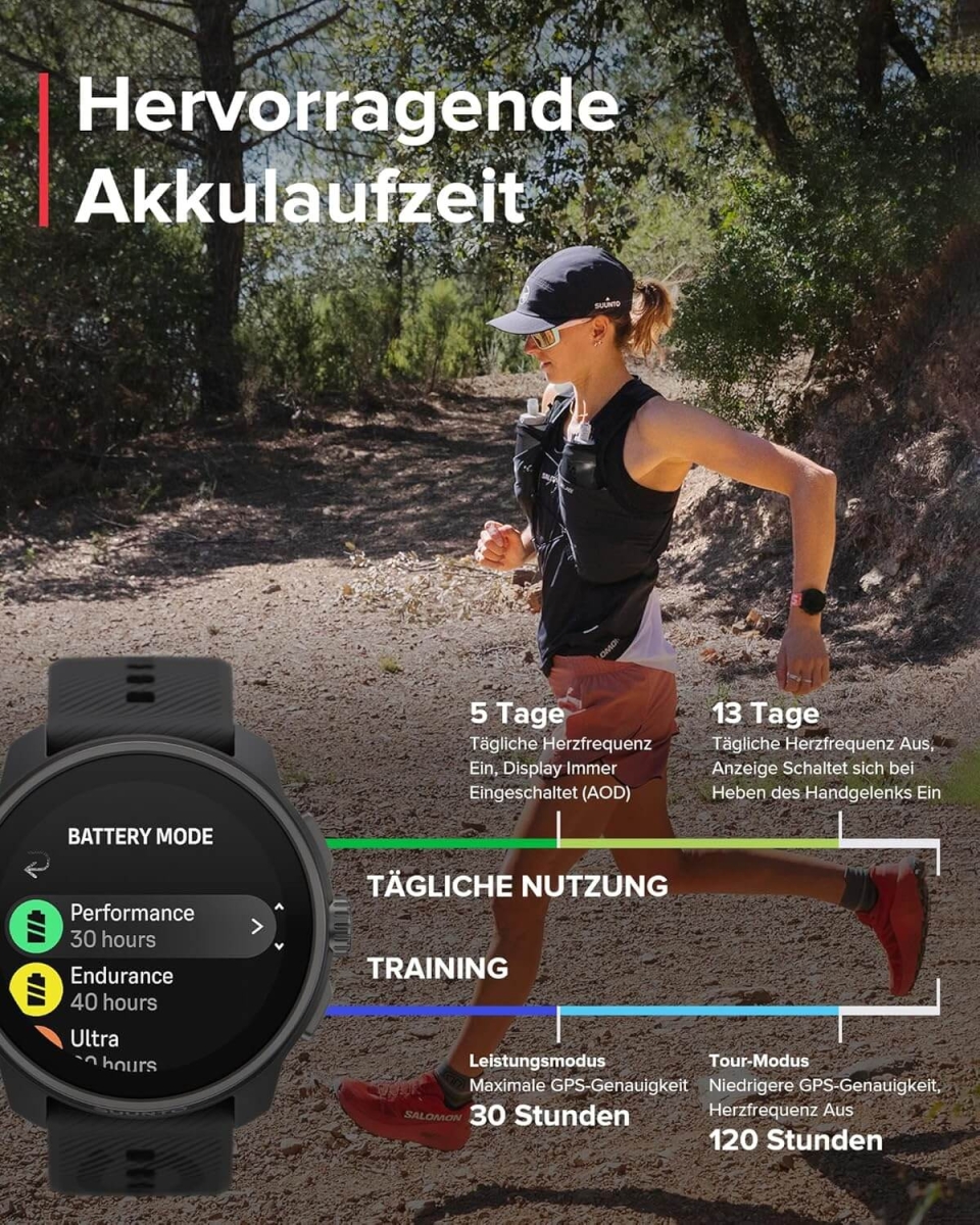 - Bis zu 5 Tage bei täglicher Nutzung mit immer eingeschaltetem Display und Herzfrequenzmessung