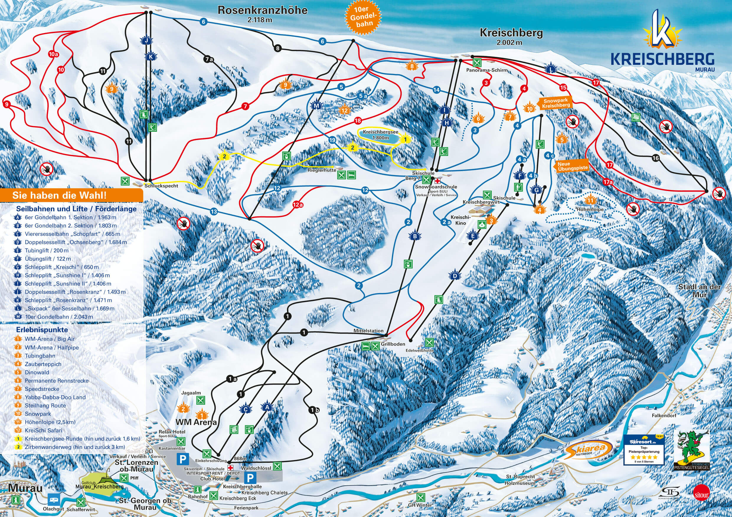 Das weltweit größte Testportal von Skigebieten „skiresort.de“ zeichnete auch 2024 die besten Skigebiete aus:Das Skigebiet Kreischberg wurde als Testsieger in der Kategorie „Extraklasse: Weltweit Führendes Skigebiet bis 60 km Pisten“ ausgezeichnet!