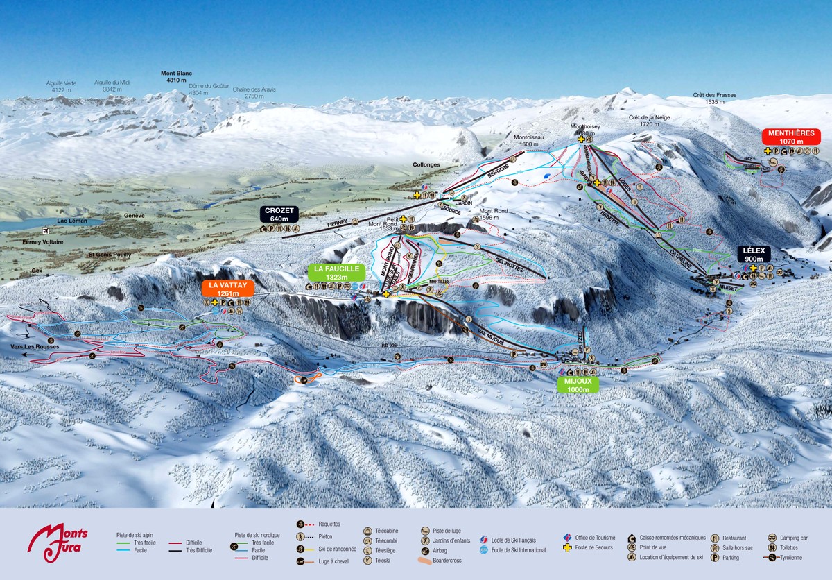 | Größe: | Das Skigebiet Monts Jura besteht aus 36,0 Pistenkilometern, davon 24.5 leichten, 10 mittleren und 1.5 schweren Pistenkilometern. |