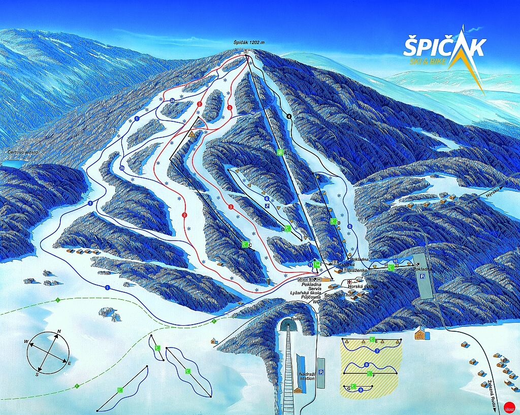 | Größe: | Das Skigebiet Špičák besteht aus 8,4 Pistenkilometern, davon 3.5 leichten, 3.5 mittleren und 1.4 schweren Pistenkilometern. |