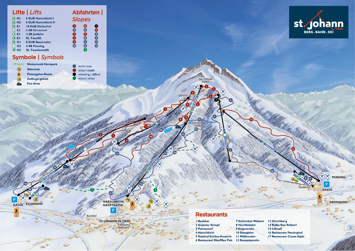 Hot| Größe: | Das Skigebiet Bergbahnen St. Johann in Tirol besteht aus 40,0 Pistenkilometern, davon 21.5 leichten, 18 mittleren und 0.5 schweren Pistenkilometern. |