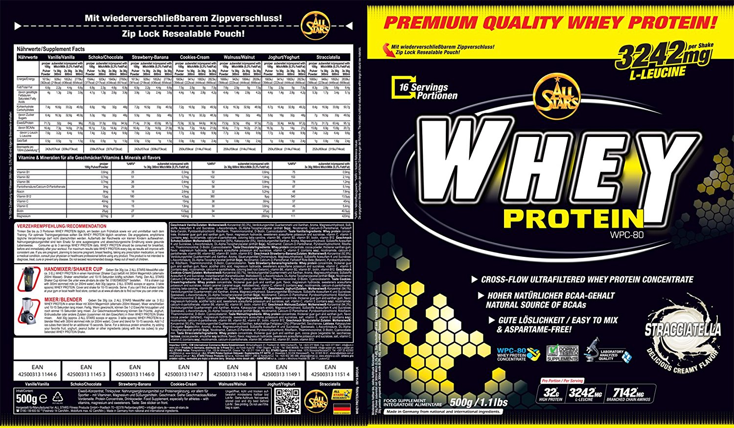 Premium Quality Wheyprotein-Concentrate. All Satrs Whey Protein ist ein hochwertiges Molkeneiweiß-Konzentrat, hergestellt im „Cross-Flow Ultrafiltrations-Verfahren“. Whey Protein verfügt über einen hohen natürlichen BCAA Gehalt non 7142 mg pro Portion, bei nur 3 g Kohlenhydraten und 3 g Fett. Sehr gut löslich, Aspartam-frei.